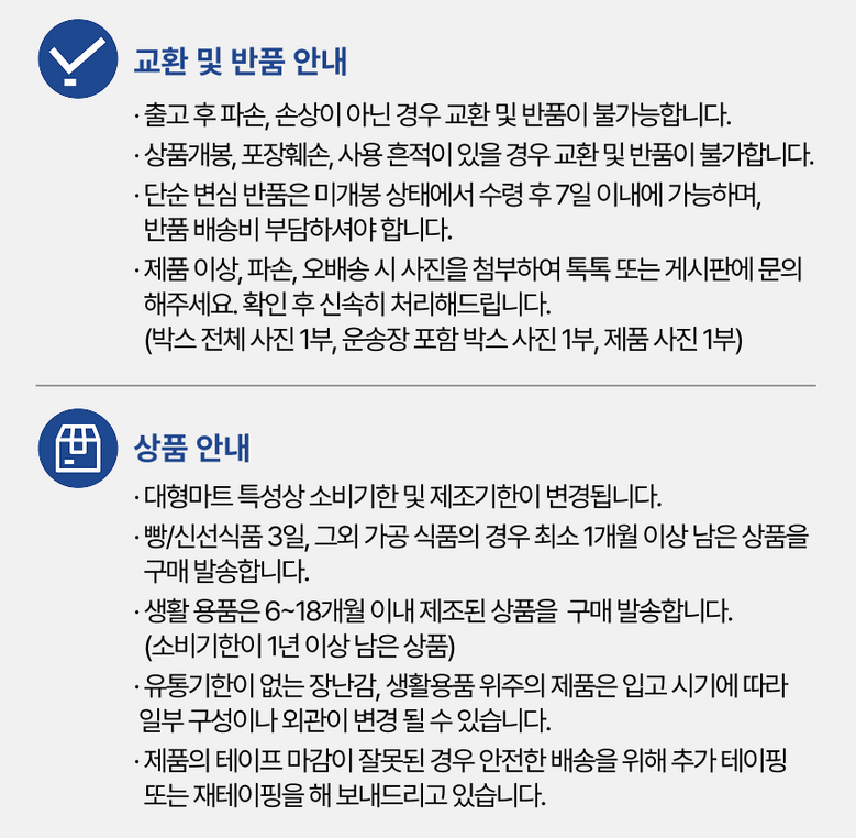 - ㆍ교환/반품에 관한 일반적인 사항은 판매자가 제시사항보다 관계법령이 우선합니다.