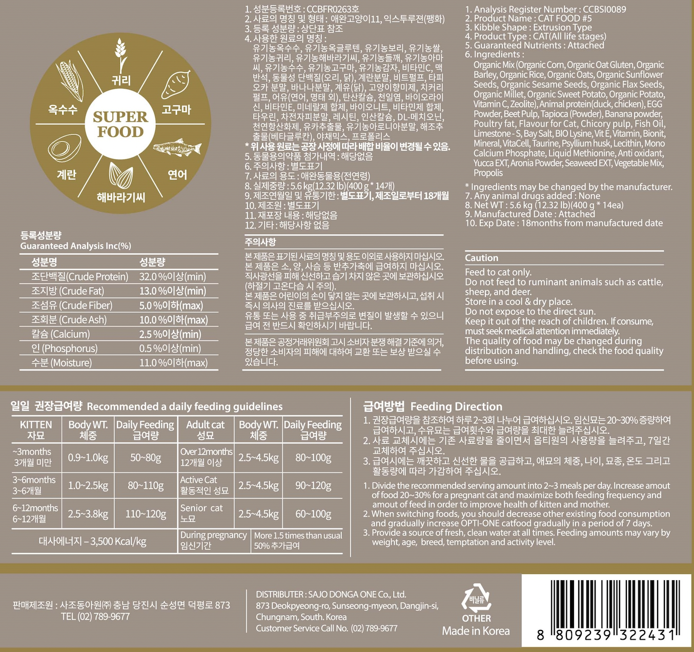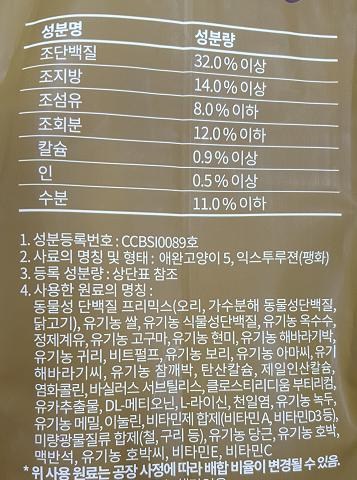 | 품명 및 모델명 | 옵티원 캣 오리&해바라기씨 | 인증/허가 사항 | 사료관리법에 따른 성분등록번호 : 컨텐츠 참조 |