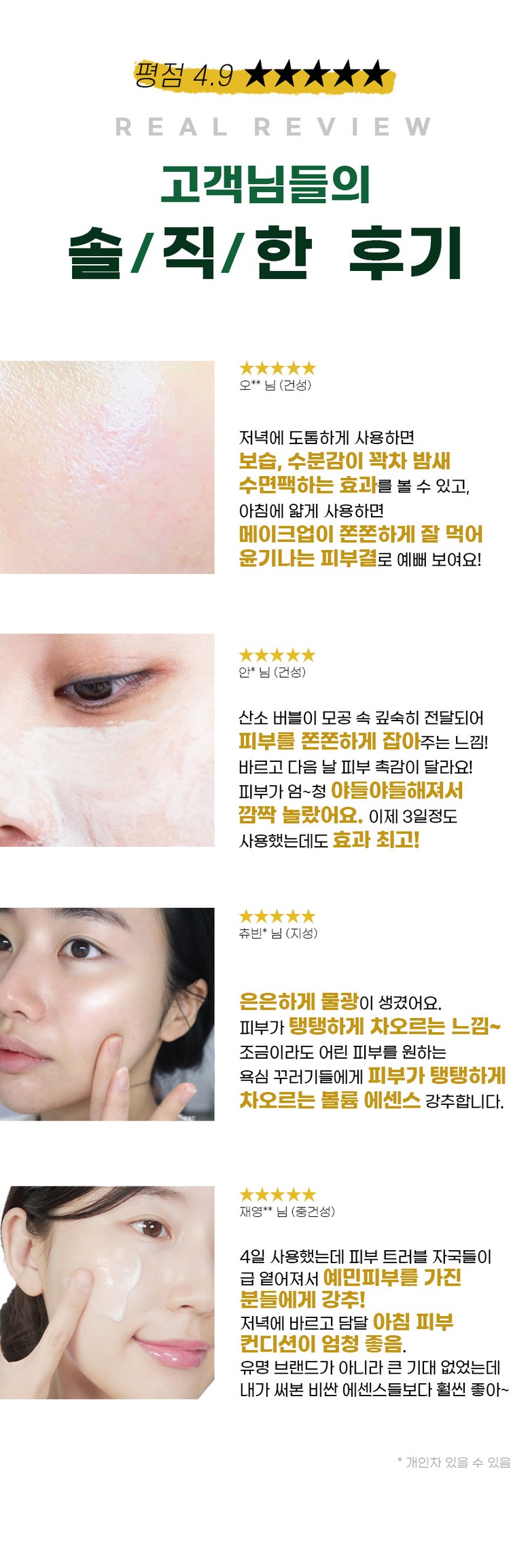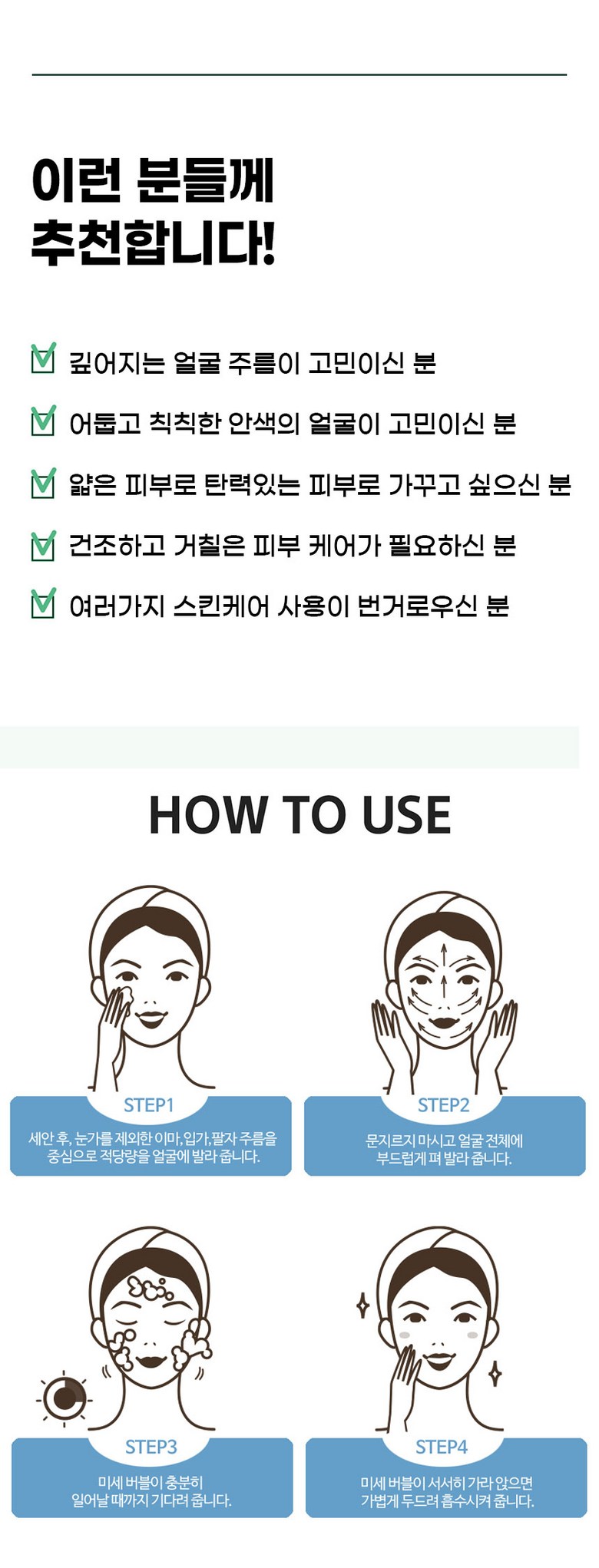| 사용기한 또는 개봉 후 사용기간 | 상품 상세페이지 참조 | 사용방법 | 세안 후 얼굴 전체에 부드럽게 펴 발라 줍니다. 미세 버블이 보글보글 충분히 일어날때까지(약 30초~1분)기다려 줍니다. 미세버블이 서서히 가라 앉으면 가볍게 두드려 흡수시켜 주세요. |