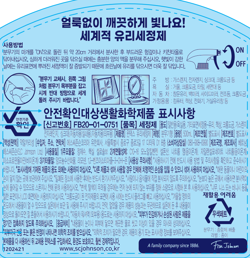 | 품목 및 제품명 | 세정제 / 윈덱스 유리세정제 | 용도(표백제의 경우 계열을 함께표시) 및 제형 | 일반용-욕실용,일반용-기타표면세정용-유리, 책상, 크롬도금, 가스렌지, 전자레인지, 싱크대),자동차용-실내용,자동차용-외부용 / 분무기형 |