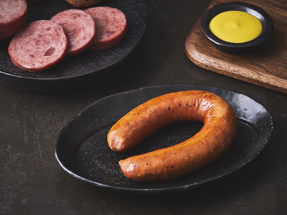 페퍼로스햄, 스파이시치킨구이, 비어슁켄, 킬바사, 스모크소시지, 구이, 바베큐, 겨자소스, 바베큐소스로 구성되어 있습니다.