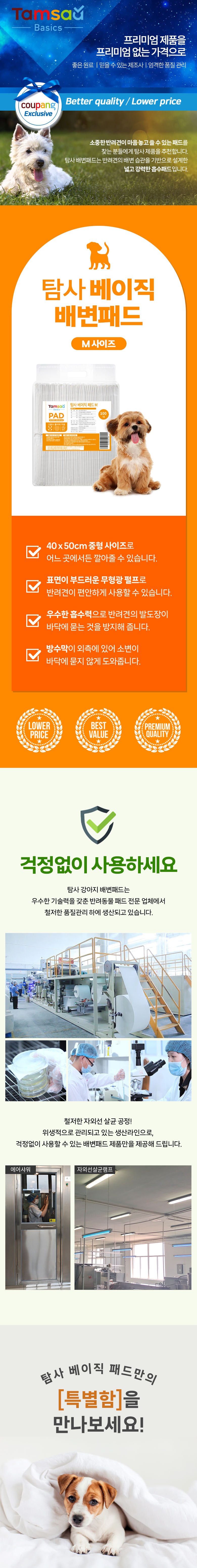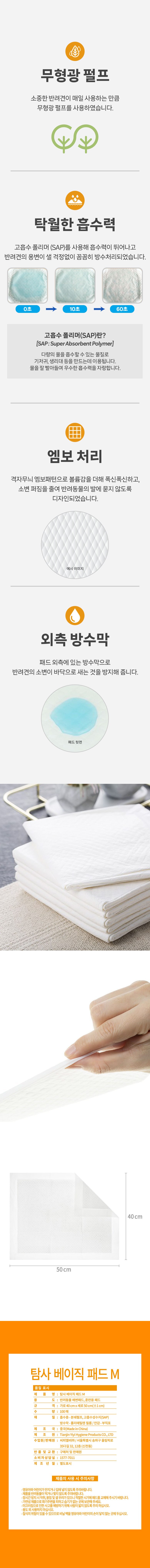 | 품명 및 모델명 | 탐사 베이직 애견패드 M (40 x 50cm) 100매입 | 인증/허가 사항 | 해당사항없음 |