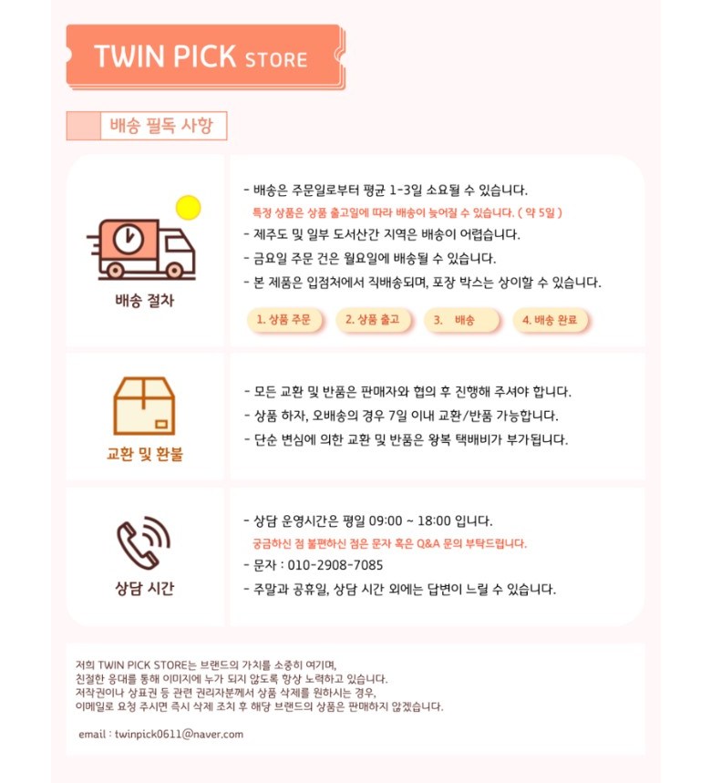 - ㆍ모니터 해상도의 차이로 인해 색상이나 이미지가 실제와 달라, 고객이 단순 변심으로 교환/반품을 무료로 요청하는 경우