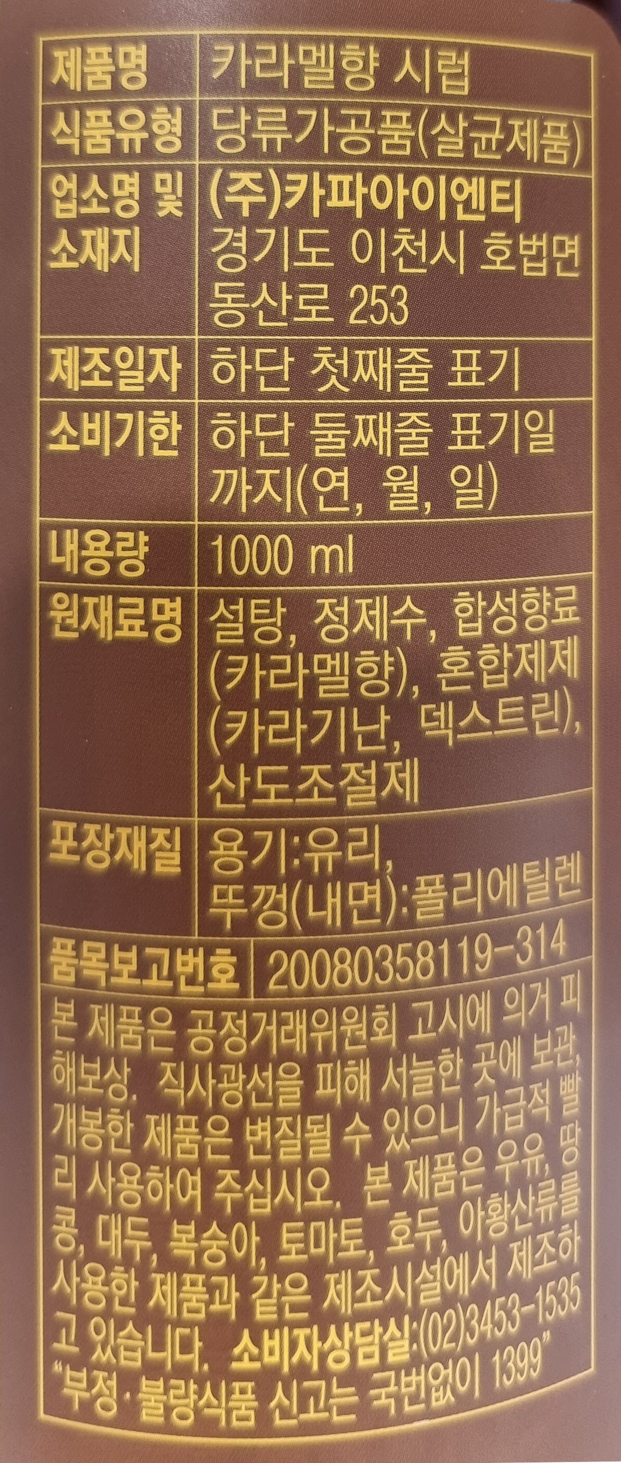 | 제품명 | 카라멜향 시럽 | 식품의 유형 | 당류가공품 |