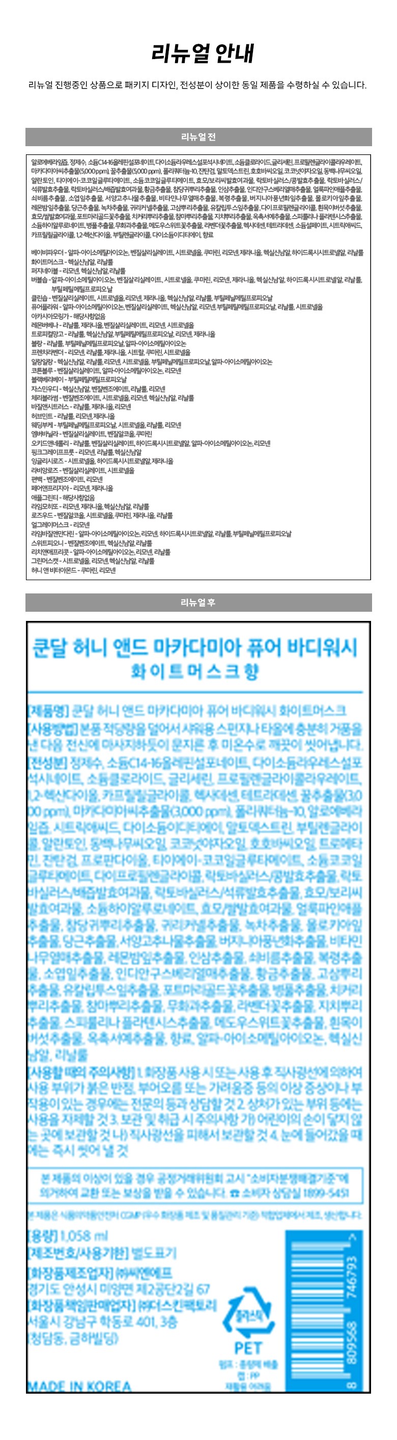 | 화장품제조업자, 화장품책임판매업자 및 맞춤형화장품판매업자 | 컨텐츠 참조 | 제조국 | 대한민국 |