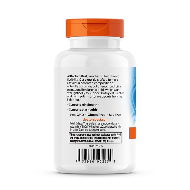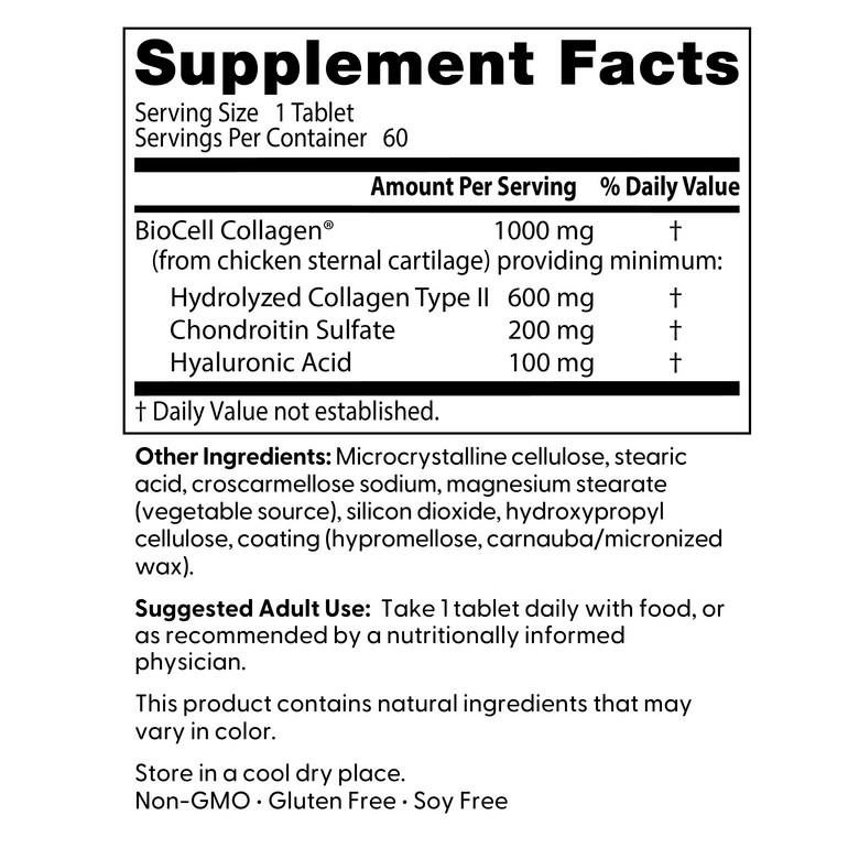 1회 제공량 당 600mg의 가수분해 콜라겐과 200mg의 콘드로이틴 설페이트, 100mg의 히알루론산을 제공하는 식이 보충제입니다. 피부에 반드시 필요한 중요 구성 물질입니다.