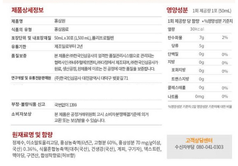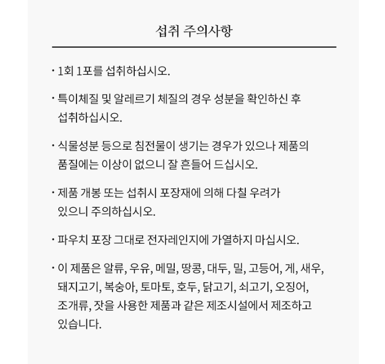 | 원료명 및 함량 | 상품 상세페이지 참조 | 영양정보 | 상품 상세페이지 참조 |