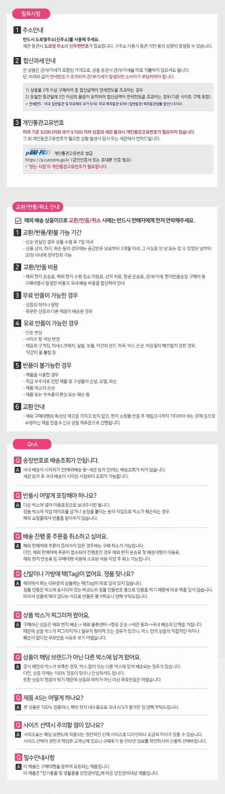 - 법규 개정에 따라 개인통관고유부호 검증 절차가 강화되었습니다. 결제 단계에서 받는 사람의 정보가 관세청 등록 정보 (성명, 휴대폰, 개인통관고유부호, 주소) 와 일치하는지 확인해주세요.