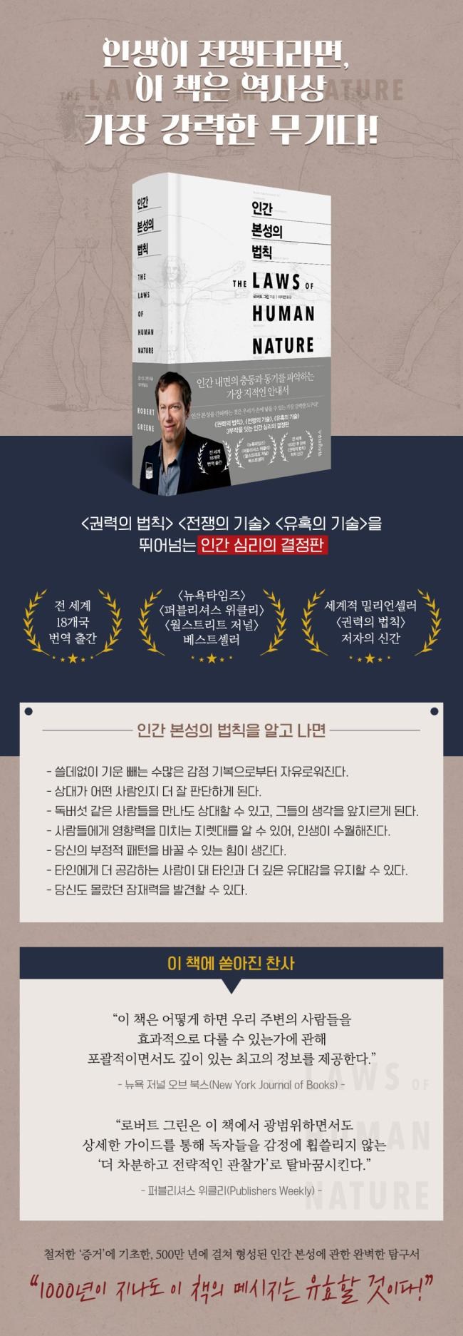 서문 | 인간의 내면을 해독하는 단 하나의 열쇠Law 01 비이성적 행동의 법칙: 나를 지배하는 감정을 극복한다두려운 것은 상대가 아니라 나의 실수다인간 본성의 열쇠: 실패의 원인을 외부에서 찾지 않는다1단계: 내 안의 편향을 자각한다2단계: 심리적 방아쇠를 확인한다3단계: 이성적 자아를 끌어낸다Law 02 자기도취의 법칙: 자기애를 타인에 대한 공감으로 바꾼다인간은 누구나 관심에 목마르다자기도취자의 네 가지 유형Law 03 역할 놀이의 법칙: 가면 뒤에 숨은 실체를 꿰뚫는다두 번째 언어인간 본성의 열쇠: 전략적 관찰자가 되라상대의 신호를 감지하는 관찰 기술최선의 얼굴만 드러내는 사람들만들어낸 진정성Law 04 강박적 행동의 법칙: 성격의 유형을 파악한다실패의 패턴인간 본성의 열쇠: 운명을 만들어낸 것은 당신 자신이다상대의 행동은 성격을 나타내는 지표긍정성으로 포장한 파괴적 유형의 사람들성격이 아니라 패턴을 바꾼다Law 05 선망의 법칙: 잡힐 듯 잡히지 않는 욕망의 대상이 되라심리학의 마술인간 본성의 열쇠: 사람들의 억압된 판타지를 자극하라욕망을 자극하는 세 가지 전략불만족을 발전의 동기로 만들어라Law 06 근시안의 법칙: 사건을 뒤흔드는 더 큰 흐름을 주시한다현실 감각이 무너지는 순간인간 본성의 열쇠: 장기적 관점에서 우선순위를 정한다단기적 사고의 네 가지 신호시간과의 관계를 넓히고 속도를 늦춘다Law 07 방어적 태도의 법칙: 상대를 긍정해서 저항을 누그러뜨린다영향력 게임인간 본성의 열쇠: 사람들의 방어막을 해제시키는 황금 열쇠상대의 마음을 사로잡는 다섯 가지 전략아이의 융통성 어른의 추론 능력Law 08 자기훼방의 법칙: 태도를 바꾸면 주변이 변한다궁극의 자유인간 본성의 열쇠: 우리는 스스로 만들어낸 현실만 본다부정적 태도의 다섯 가지 유형열린 태도로 가는 다섯 단계의 로드맵 Law 09 억압의 법칙: 내 안의 어둠을 직시한다닉슨의 비극인간 본성의 열쇠: 내면의 그림자를 포착한다그림자의 일곱 가지 유형내 안의 그림자와 접속하라Law 10 시기심의 법칙: 상대의 자존심을 건드리지 않는다치명적인 친구인간 본성의 열쇠: 상대의 분노에는 시기심이 자리 잡고 있다시기심의 신호시기심의 경향은 어린 시절에 만들어진다시기심이 발동하는 상황비교하는 성향을 생산적으로 바꾸는 요령Law 11 과대망상의 법칙: 나의 한계를 현실적으로 평가한다성공이라는 망상인간 본성의 열쇠: 상대는 내가 원하는 대로 반응하지 않는다위험한 리더높은 만족감을 얻는 다섯 가지 원칙Law 12 젠더 고정관념의 법칙: 나에게 맞는 성 역할을 창조한다내 안의 다양한 측면을 끄집어낸다인간 본성의 열쇠: 상대의 억압된 부분을 포착한다젠더의 여섯 가지 투영 유형최초의 본성으로 돌아간다Law 13 목표 상실의 법칙: 인생의 소명을 발견하고 지침으로 삼는다내면에서 들려오는 목소리인간 본성의 열쇠: 지금의 선택이 인생 전체에 영향을 미친다인생의 장애물을 헤쳐 나가는 다섯 가지 전략 가짜 목적의 함정Law 14 동조의 법칙: 집단의 영향력에 저항하라마오쩌둥의 실험인간 본성의 열쇠: 집단이 주는 영향력을 인식한다집단이 빠지기 쉬운 패턴리더를 둘러싼 암투어떻게 현실 집단을 만들 것인가Law 15 변덕의 법칙: 권위란 따르고 싶은 모습을 연출하는 기술이다당연한 것은 없다인간 본성의 열쇠: 인간은 늘 양면적인 감정을 느낀다기꺼이 따르게 만들어라양심의 목소리 Law 16 공격성의 법칙: 상냥한 얼굴 뒤의 적개심을 감지한다세련된 공격자인간 본성의 열쇠: 공격성은 모든 인간에게 잠재되어 있다인간의 공격성은 무력감에서 온다수동적 공격자로부터 우리를 보호하는 법통제된 공격성Law 17 세대 근시안의 법칙: 시대의 흐름에서 기회를 포착한다영광스러운 과거의 상실인간 본성의 열쇠: 세대의 변화는 반복되는 역사의 일부이다시대정신의 탄생인간 역사의 패턴세대의 틀에서 벗어나는 전략시간은 인간이 만들어낸 것이다Law 18 죽음 부정의 법칙: 인간의 운명인 죽음을 생각한다옆구리에 박힌 총알인간 본성의 열쇠: 죽음이라는 현실과 연결되어야 한다죽음을 통한 삶의 철학감사의 글 | 찾아보기 | 참고 문헌,저자소개