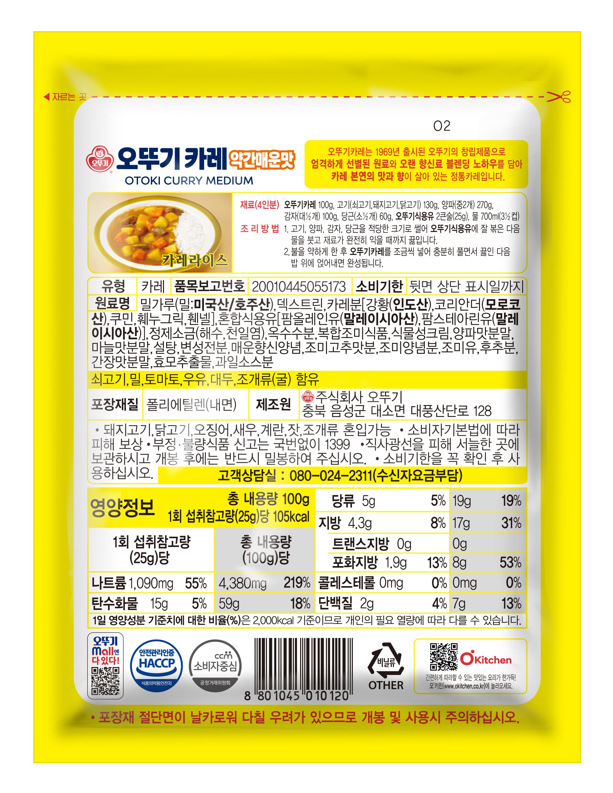 | 제품명 | 오뚜기카레(약간매운맛) | 식품의 유형 | 컨텐츠 참조 |