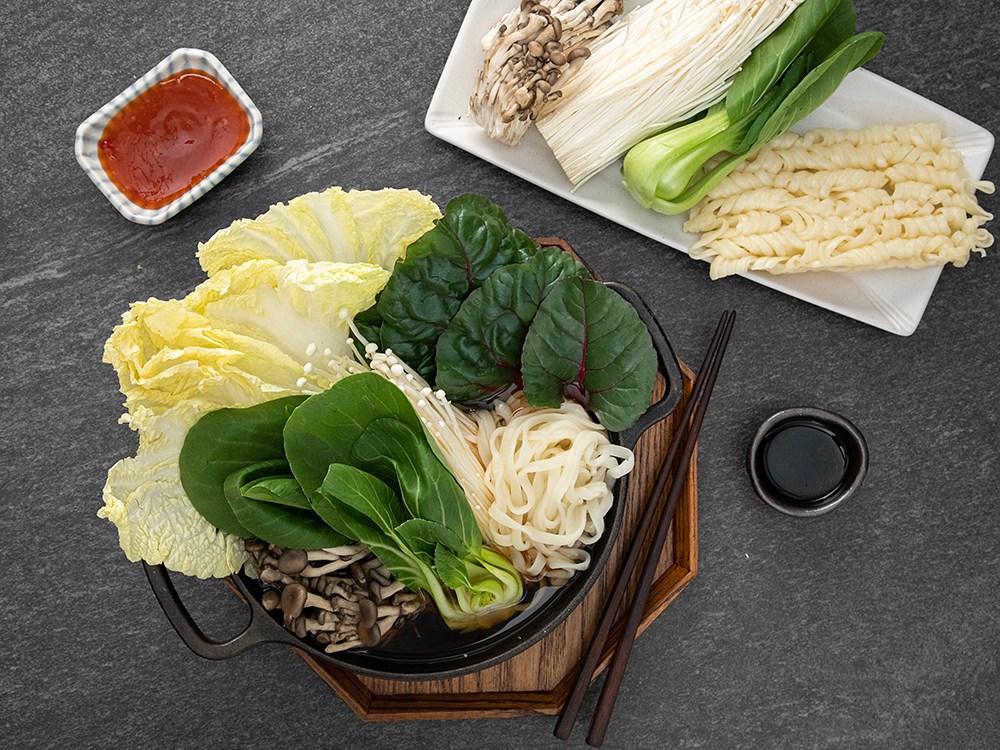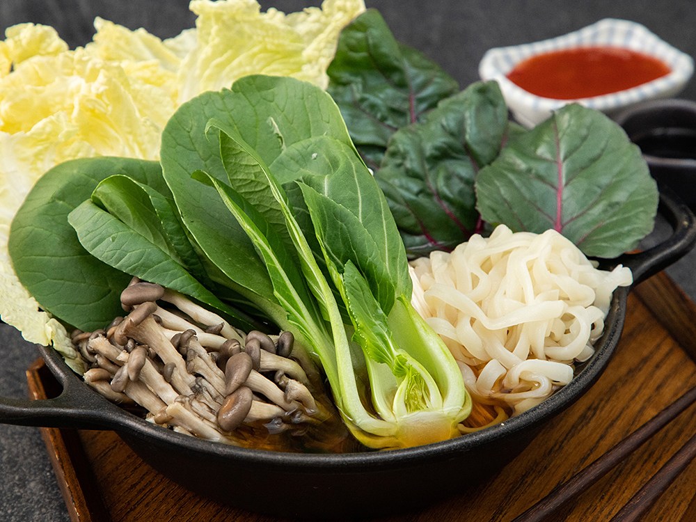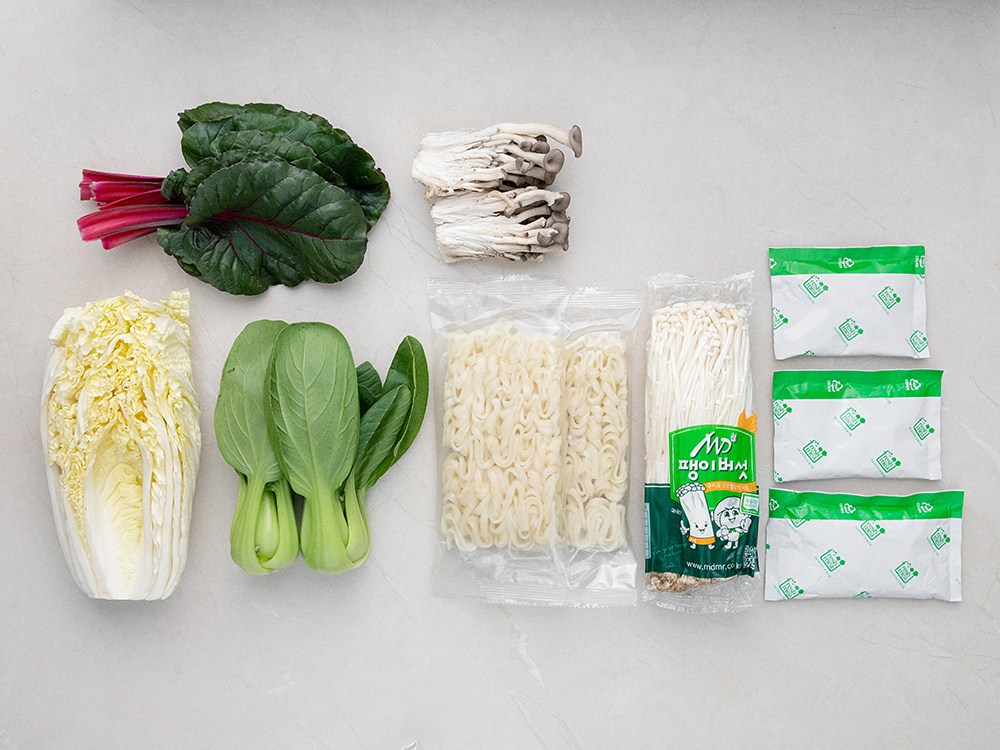 적근대, 느타리, 알배기, 청경채, 칼국수 사리, 팽이버섯, 샤브육수, 칠리소스, 유자폰즈로 구성되어 있습니다.