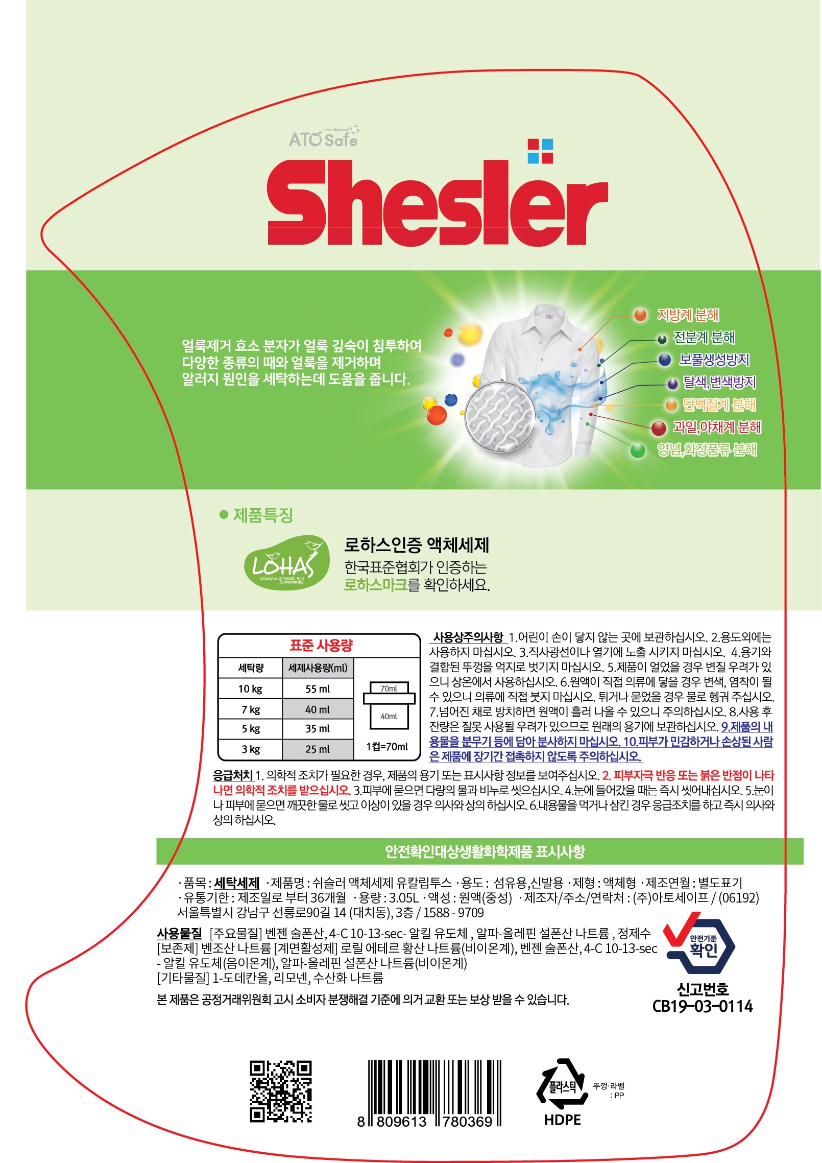 | 품목 및 제품명 | 세탁세제/쉬슬러 액체세제 유칼립투스 | 용도(표백제의 경우 계열을 함께표시) 및 제형 | 신발용,섬유용/액체형 |
