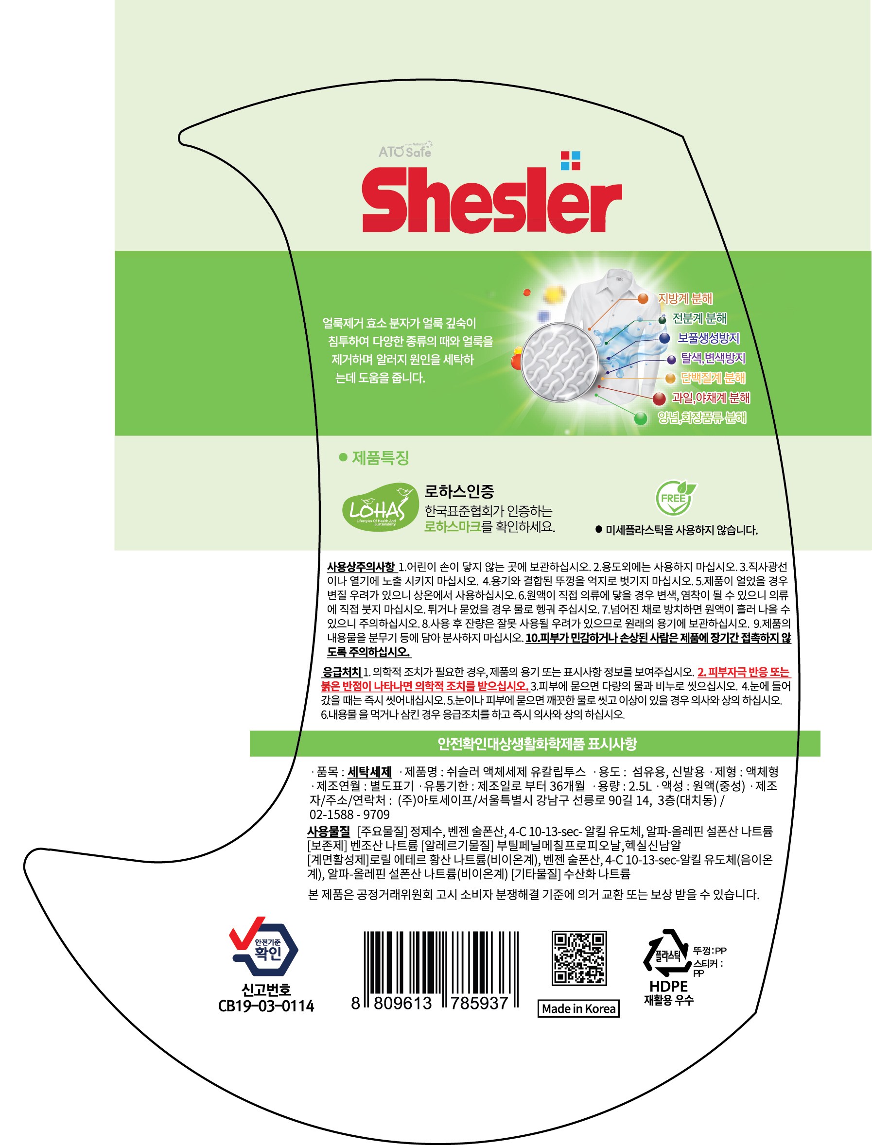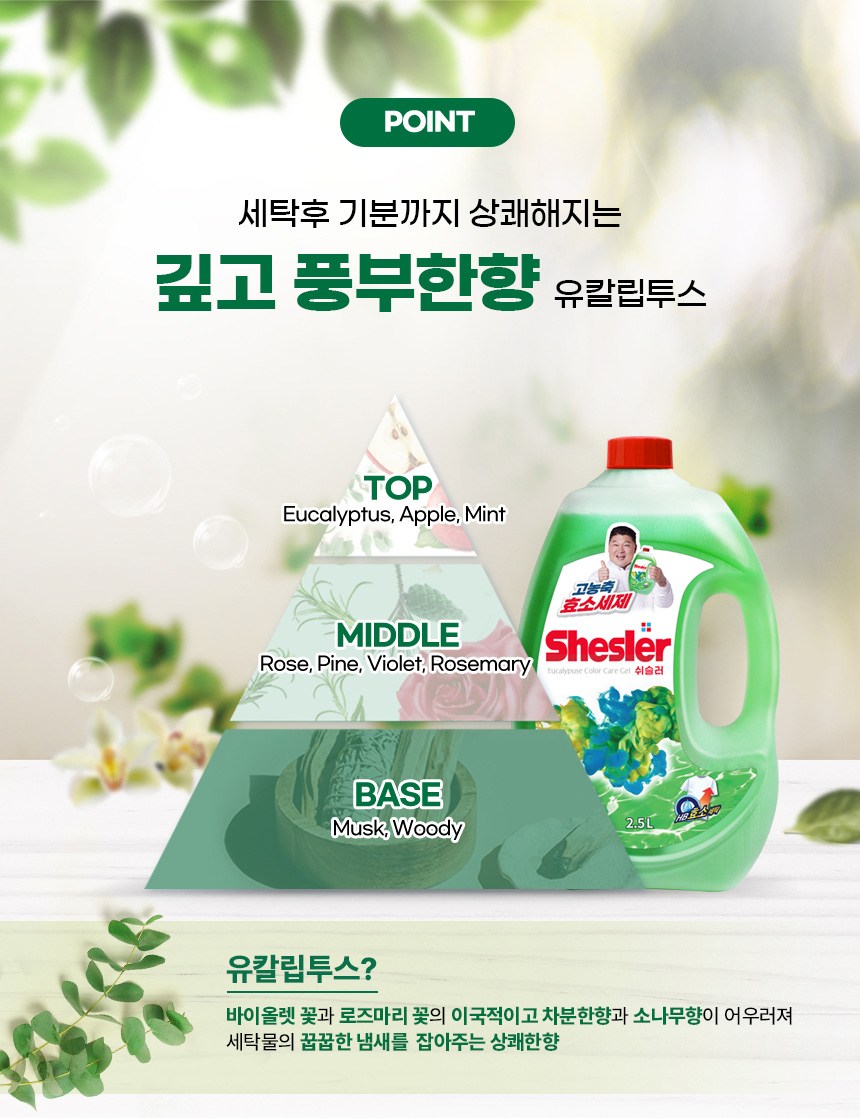| 품목 및 제품명 | 세탁세제 / 쉬슬러 액체세제 유칼립투스 | 용도(표백제의 경우 계열을 함께표시) 및 제형 | 섬유용, 신발용 / 액체형 |