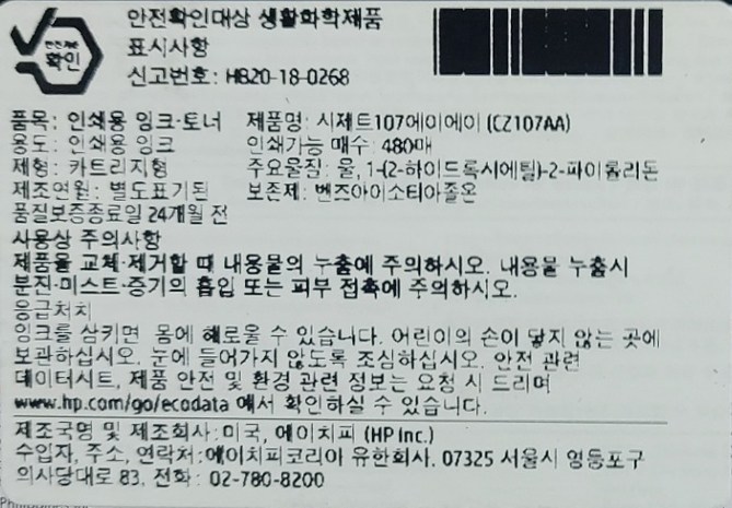 | 품목 및 제품명 | 인쇄용 잉크,토너/CZ107AA | 용도(표백제의 경우 계열을 함께표시) 및 제형 | 인쇄용 잉크/카트리지형 |