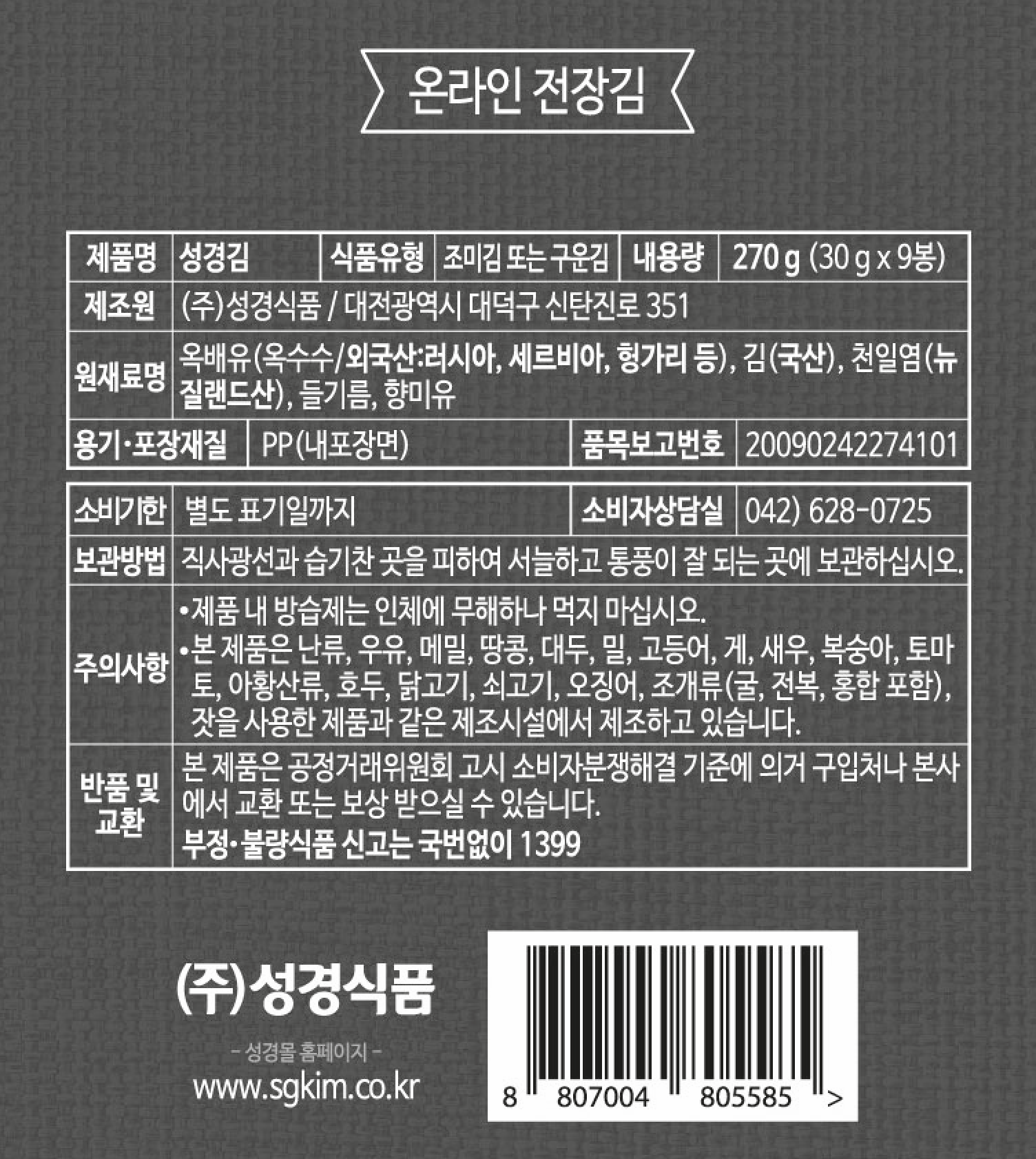 | 포장단위별 내용물의 용량(중량), 수량 | 270g, 1세트 | 원재료명 및 함량 | 컨텐츠 참조 |