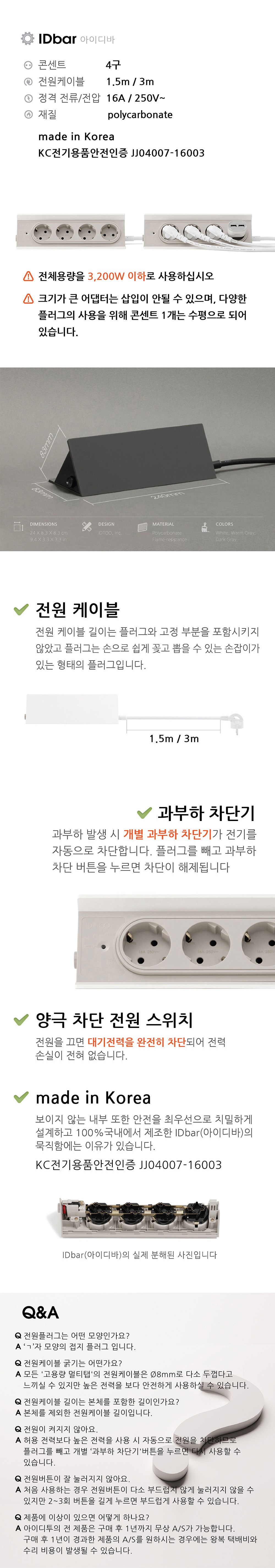 | 품명 및 모델명 | 콘센트(이동형멀티콘센트) / 모델명: IDBAR / 인증모델명: IDBAR-1 | KC 인증정보 | JJ04007-16003 |
