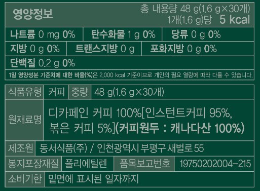 | 제품명 | 카누 디카페인 아메리카노 | 식품의 유형 | 컨텐츠 참조 |