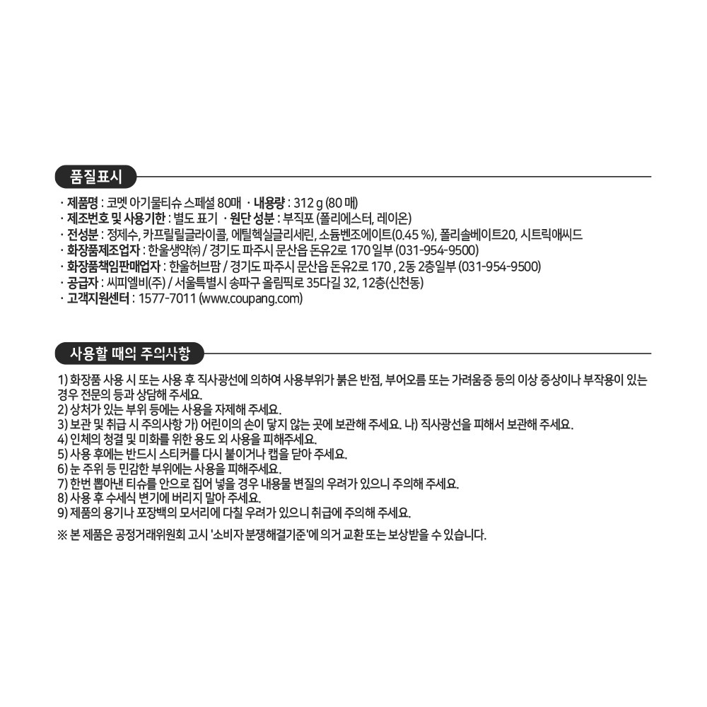 | 사용기한 또는 개봉 후 사용기간 | 본 상품은 해당 물류센터 직발송 상품인 관계로 해당 정보가 매번 변경되어 정확한 정보제공이 어렵습니다. 관련 사항은 쿠팡고객센터(1577-7011)로 문의 바랍니다. | 사용방법 | 컨텐츠 참조 |