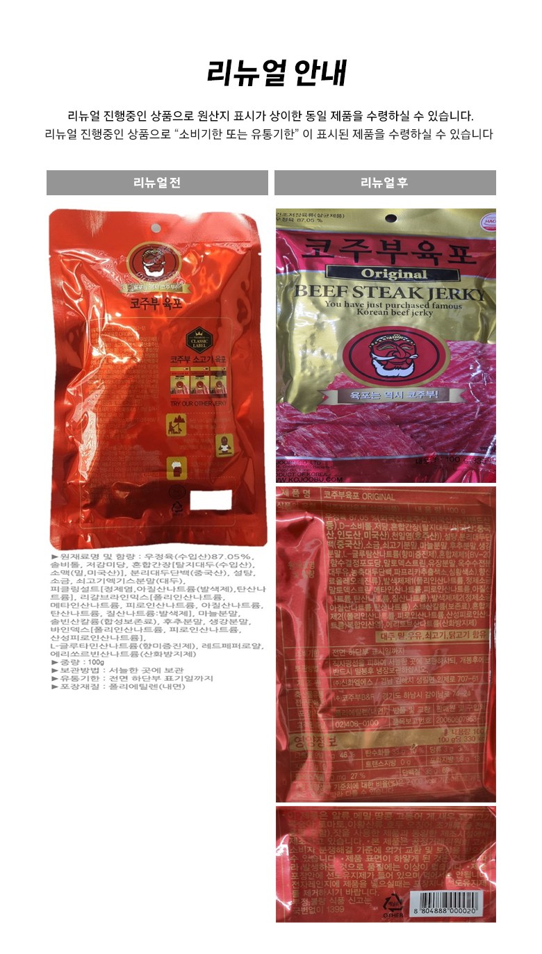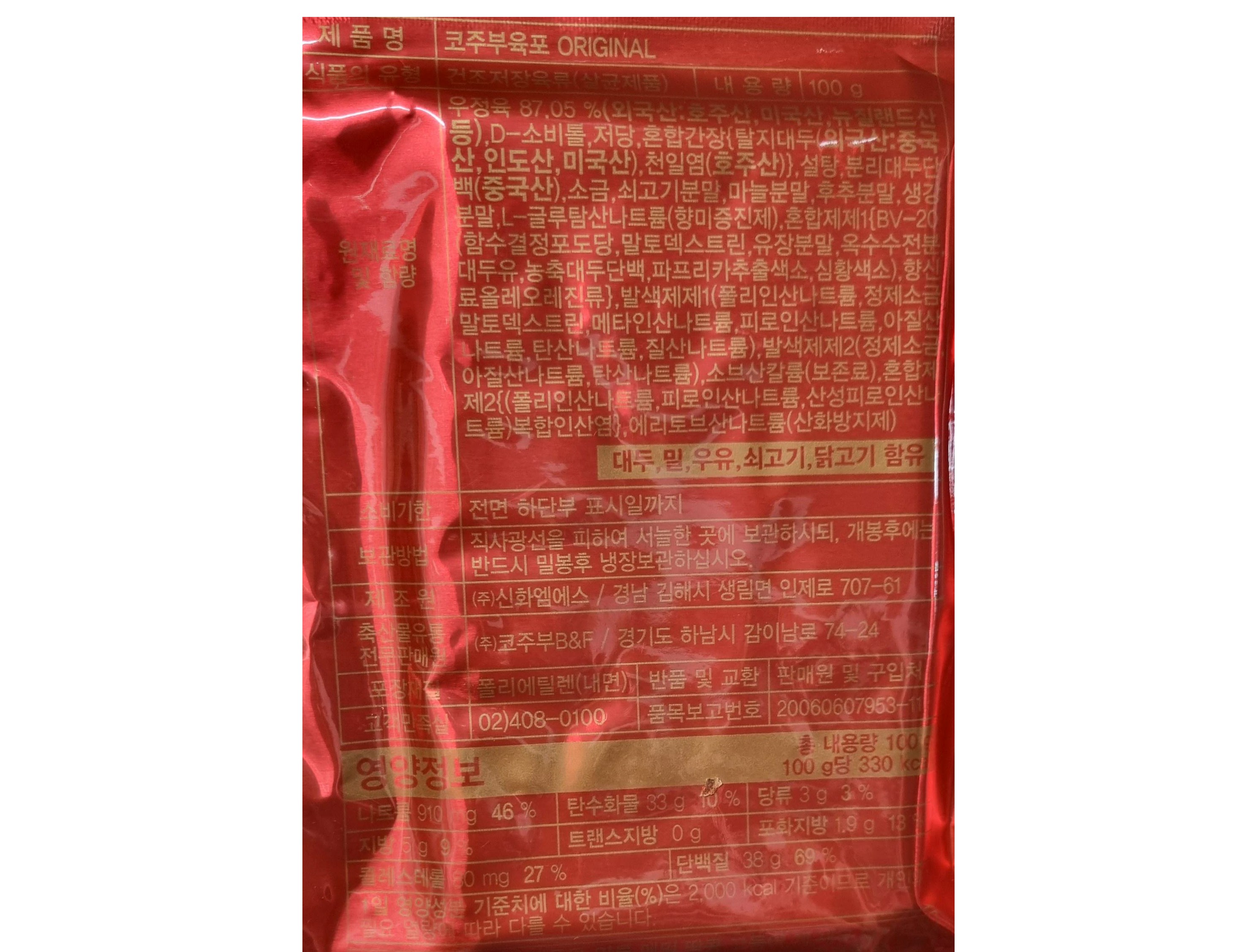 | 제품명 | 코주부 소고기 육포 | 식품의 유형 | 건조저장육류(살균제품) |