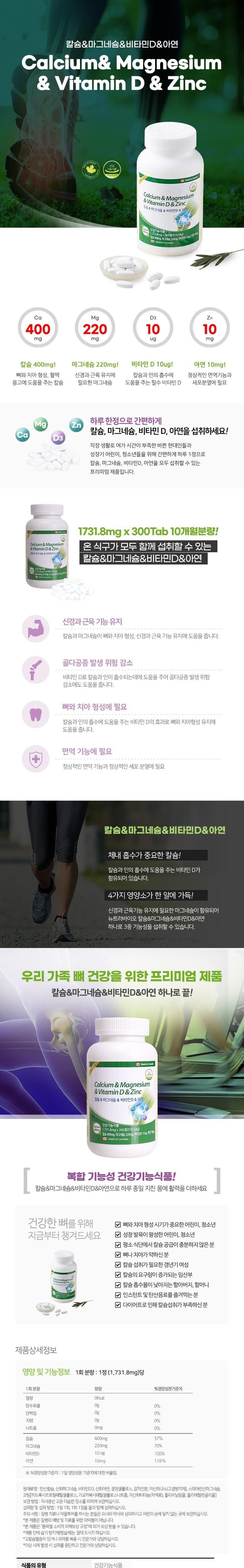 | 원료명 및 함량 | 탄산칼슘, 산화마그네슘, 비타민D3, 결정셀룰로스, 감자전분, 카복시메틸셀룰로스나트륨, 이산화규소(고결방지제), 스테아린산마그네슘, 이산화티타늄(착색료, 정제의제피) | 영양정보 | 1일섭취량 : 1정(1,710mg)당 열량 0kcal, 탄수화물 0g(0%), 단백질 0g(0%), 지방 0g(0%), 나트륨 0mg(0%), 칼슘 400mg (57%), 마그네슘 220mg(70%), 비타민D 10ug(400IU) 75%,아연 10mg(118%) *%영양소기준치 : 1일 영양소기준치에 대한 비율 |