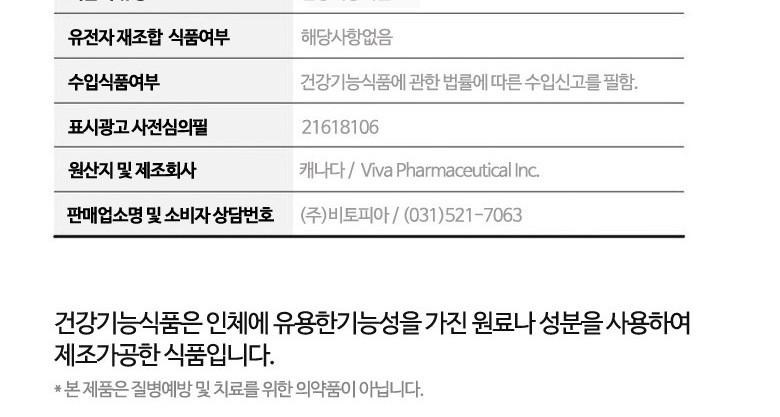 | 제품명 | 칼슘&마그네슘&비타민D&아연 300정 (10개월분) | 제조업소의 명칭과 소재지 | 원산지 및 제조회사 : 캐나다 / Viva Pharmaceutical Inc수입업소명 및 소재지 : ㈜비토피아 ,경기도 남양주시 와부읍 수레로 9번길 13 아이비타워 701호 |