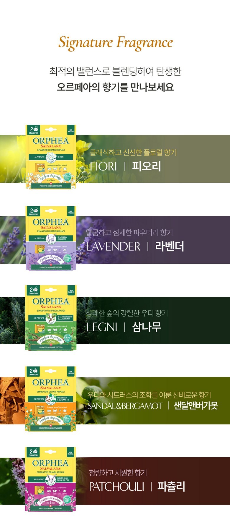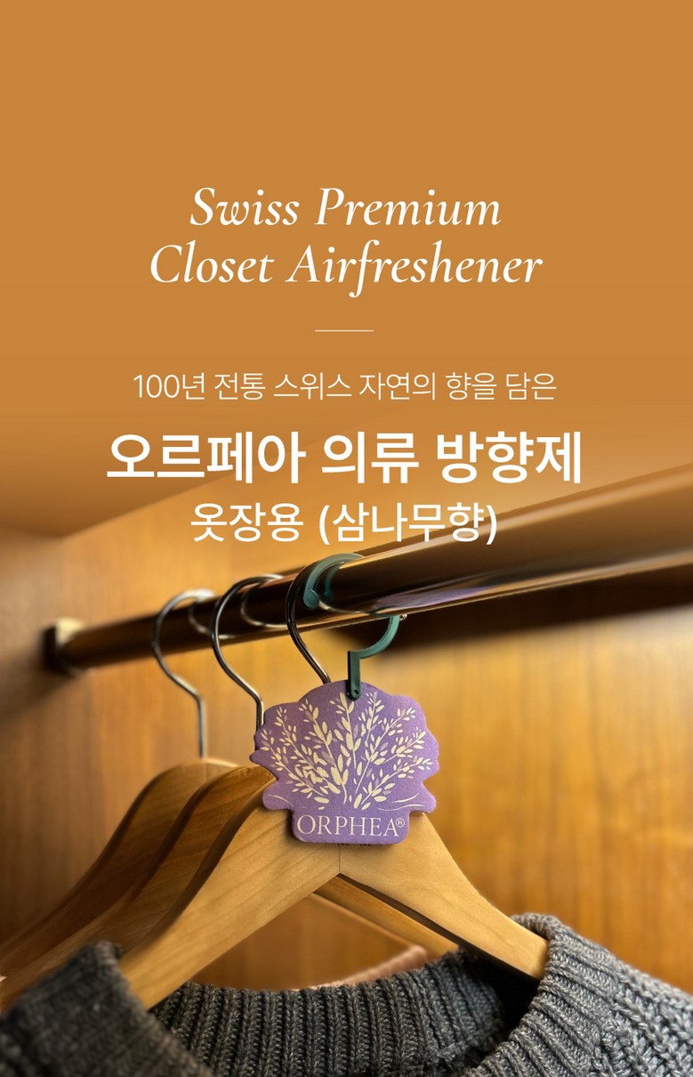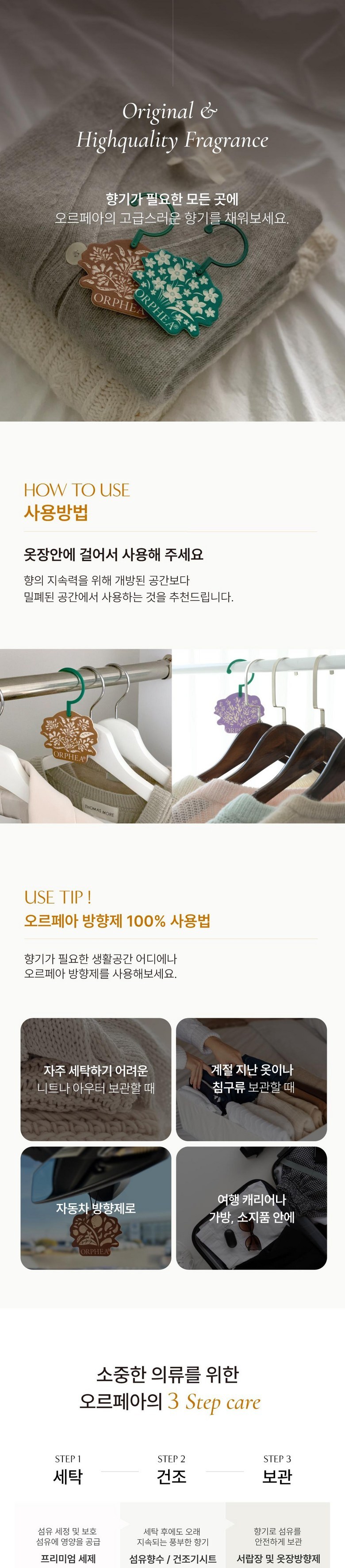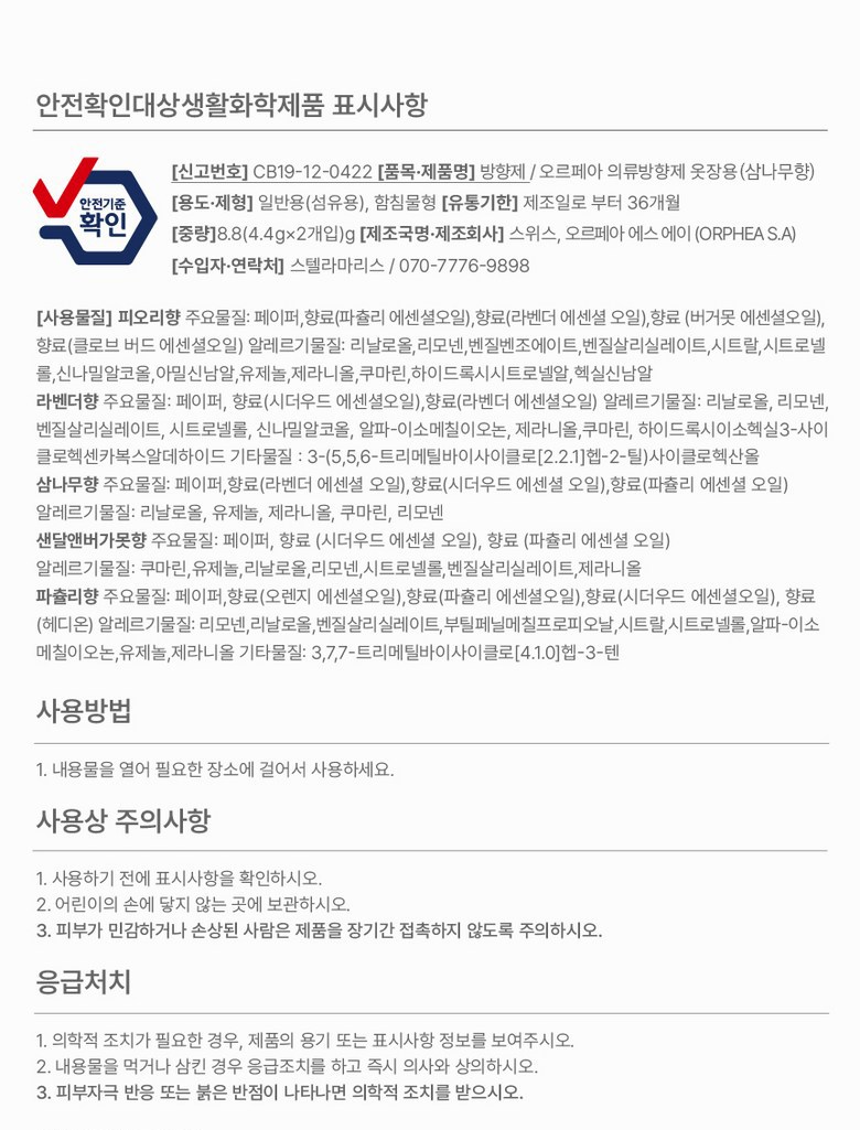 | 품목 및 제품명 | 방향제 / 오르페아 의류 방향제 옷장용(삼나무향) | 용도(표백제의 경우 계열을 함께표시) 및 제형 | 일반용(섬유용) / 함침물형 |