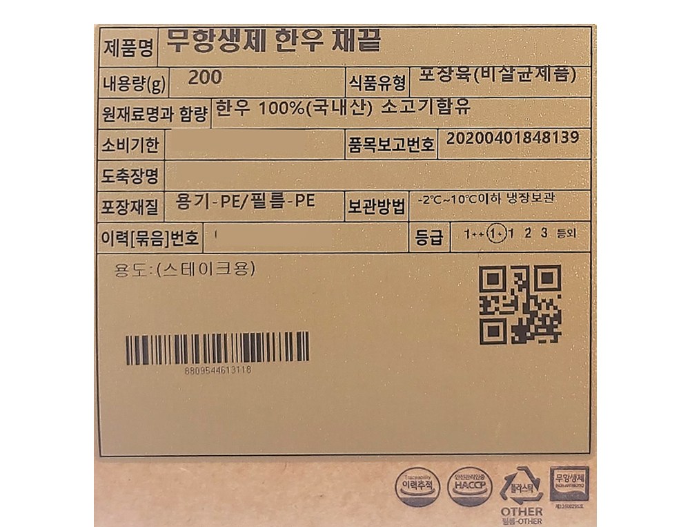 | 소비기한 또는 품질유지기한 | 소비기한(또는 유통기한) : 2026년 03월 04일 이거나 그 이후인 상품 | 세부 품목군별 표시사항 | 축산물 등급표시 : 1+등급 / 이력번호 표시유무 : 이력번호 표시제품임 |