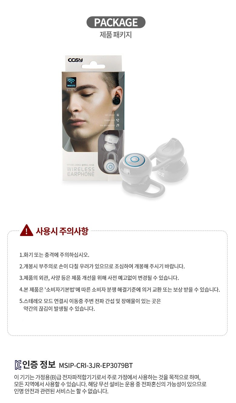 | 품명 및 모델명 | 마이크로 스테레오 블루투스이어폰_블랙 / EP3079BT | KC 인증정보 | MSIP-CRI-3JR-EP3079BT |