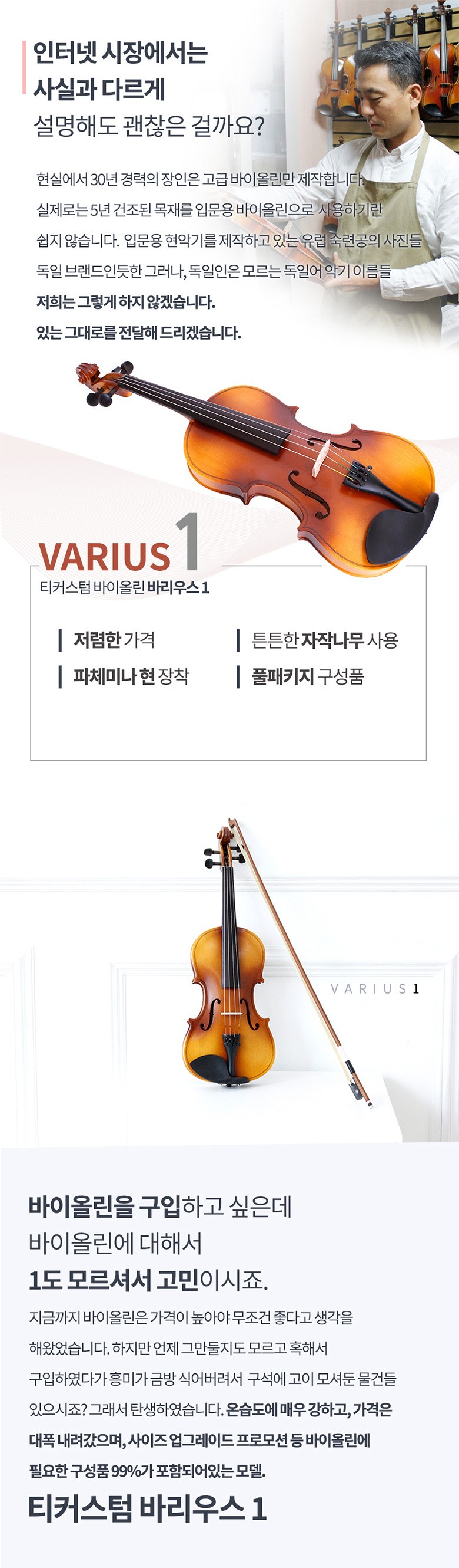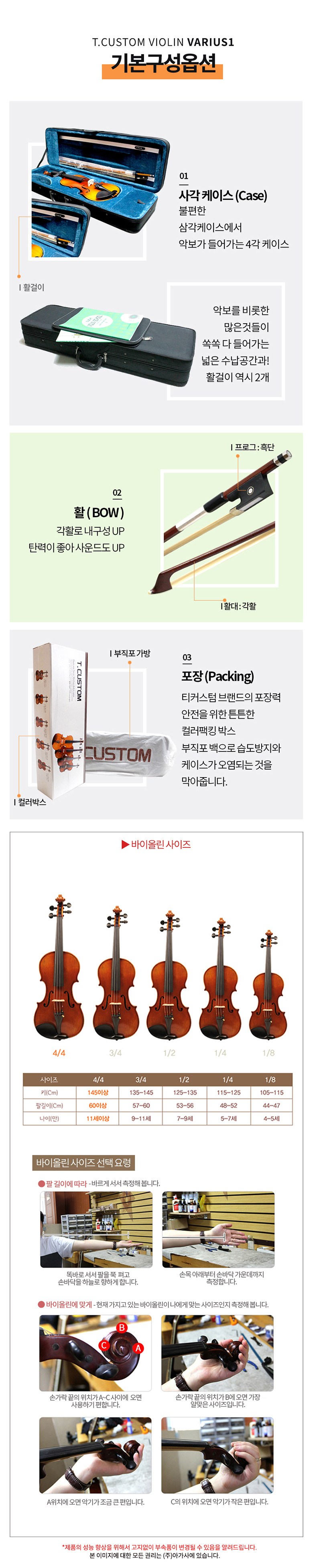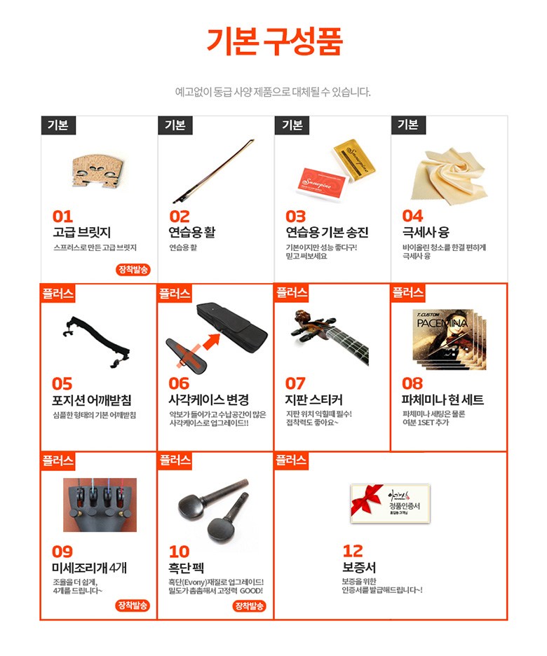 - 구성품: 바이올린 + 케이스 + 활 + 브릿지 + 송진 + 극세사 융