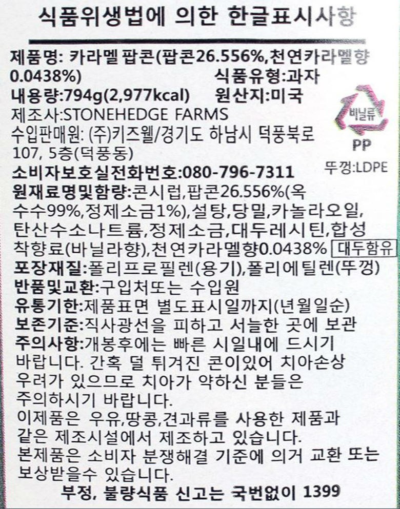 | 제품명 | 카라멜 팝콘(팝콘26.556%, 천연향료 카라멜향0.0438%) | 식품의 유형 | 과자 |