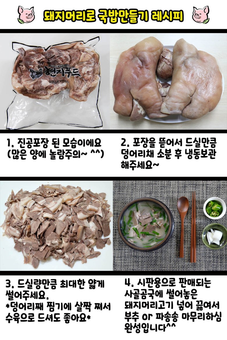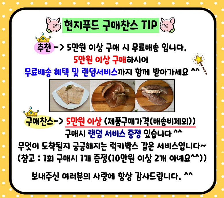 | 품목 또는 명칭 | 현지푸드 국내산 삶은돼지머리 한마리분, 염통2개 | 포장단위별 내용물의 용량(중량),수량,크기 | 2.5KG내외 (돼지머리마다 무게가 달라 중량의 차이는 조금씩 있을 수 있습니다. ) |