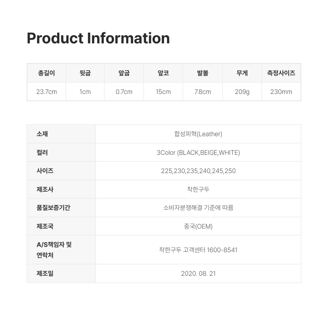 | 치수 | 240mm | 제조자(수입자) | 착한구두 |