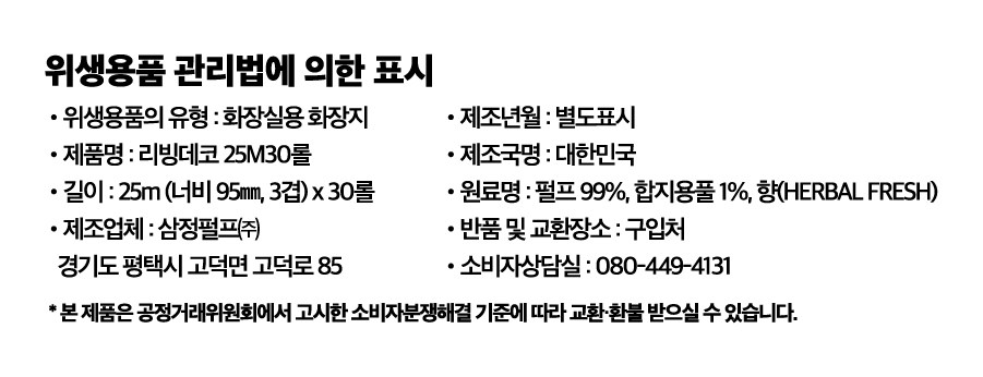 | 품명 및 모델명 | 리빙데코 25M30롤 | 인증사항 | 위생용품 |