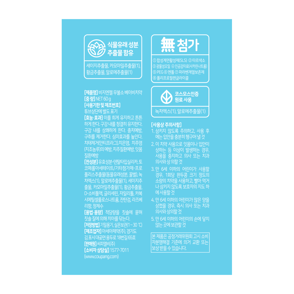| 품명 및 모델명 | 비지엔젤 무불소 베이비치약 | 인증/허가 사항 | 의약외품 |