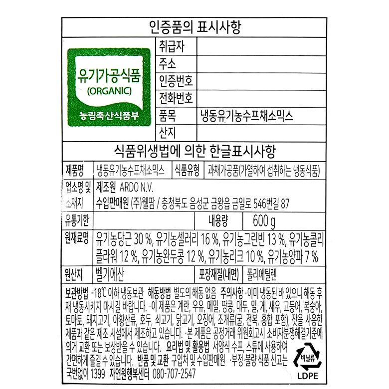 | 제품명 | 냉동유기농 수프채소믹스 | 식품의 유형 | 과채가공품(가열하여 섭취하는 냉동식품) |