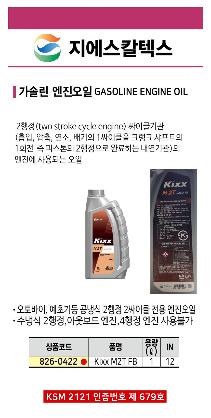 | 품명 및 모델명 | 2행정 엔진오일 GS칼텍스 KIXX 1L(1000ml), 1개, Kixx M 2T JASO FB (1L) | 동일모델 출시년월 | 업체미제공 |