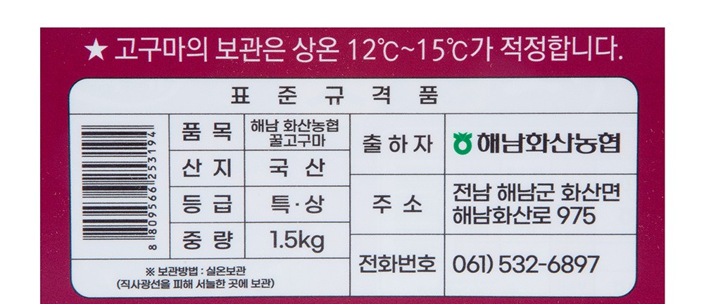 | 품목 또는 명칭 | 고구마 | 포장단위별 내용물의 용량(중량),수량,크기 | 1.5kg, 1개 |