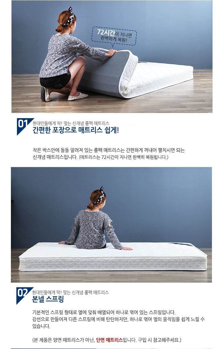 | 품명 | 본넬 스프링 롤팩매트리스 | KC 인증정보 | 알 수 없음(업체미제공) |