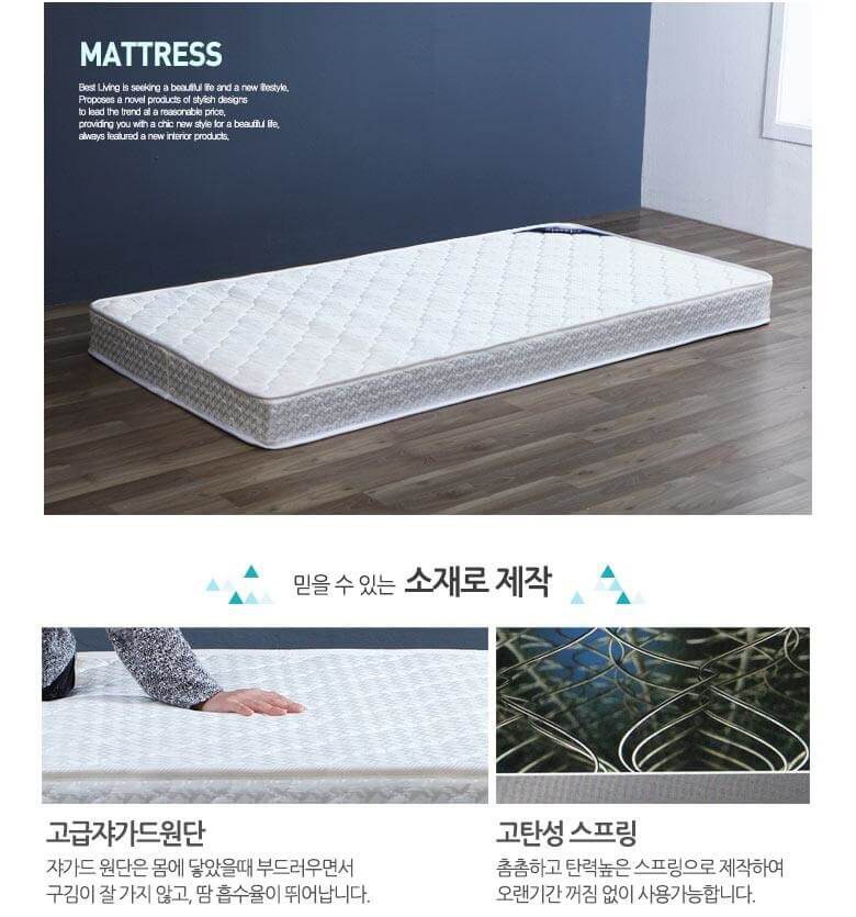 | 주요 소재 | 코일스프링, 고탄성폼, 백색견면, 퀘팅폼, 부직포, 쟈가드원단 외 | 제조자(수입자) | 베스트리빙 |