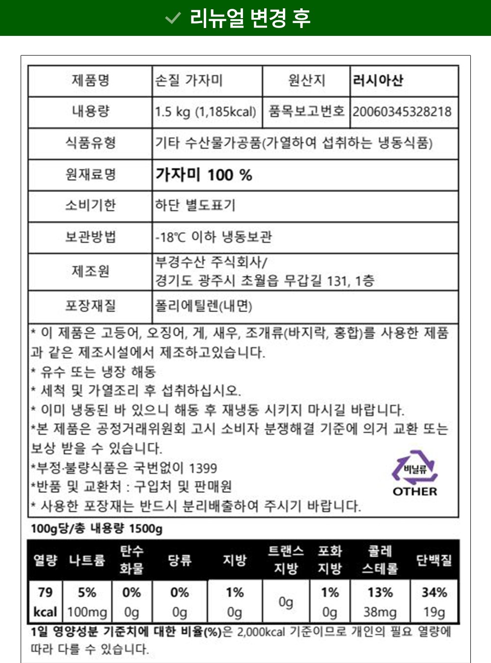 | 포장단위별 내용물의 용량(중량), 수량 | 1.5kg, 1개 | 원재료명 및 함량 | 컨텐츠참조 |