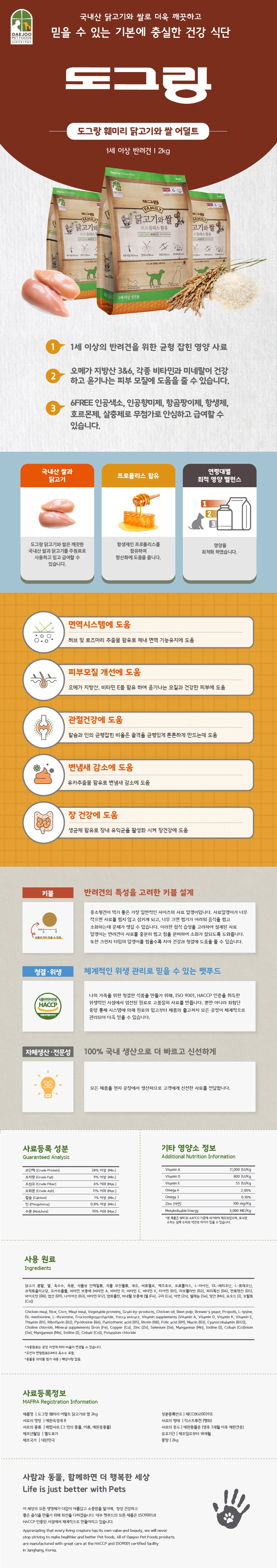 | 품명 및 모델명 | 도그랑 훼미리 어덜트 닭고기와 쌀 2kg | 인증/허가 사항 | 사료관리법에 따른 성분등록번호 : 컨텐츠 참조 |