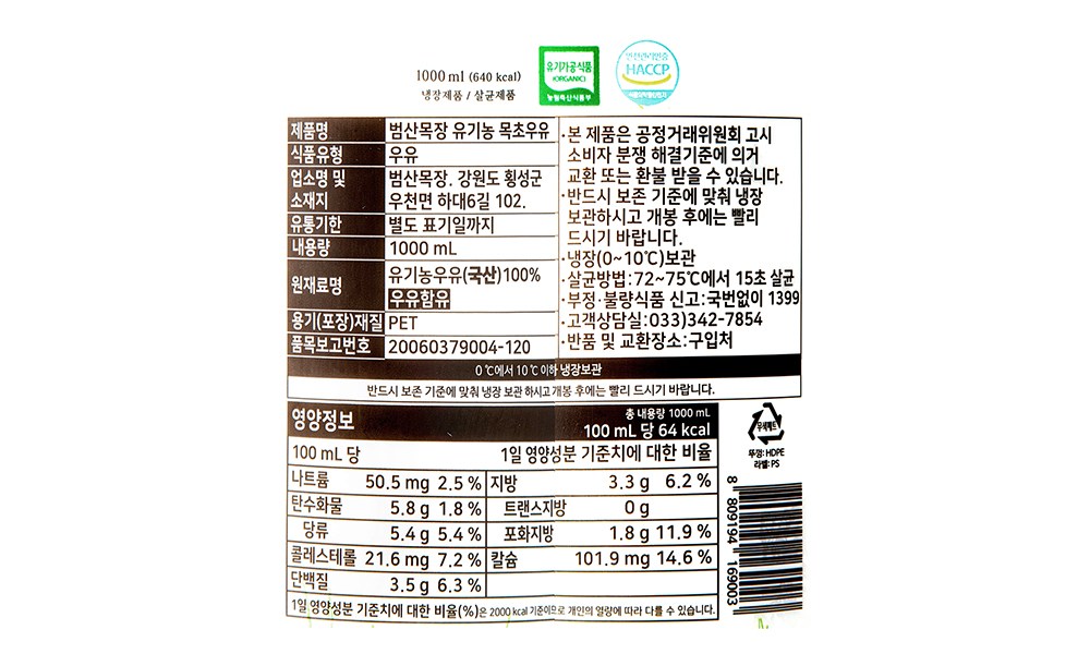 범산목장 유기농 목초우유