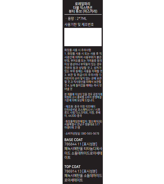 | 사용기한 또는 개봉 후 사용기간 | 본 상품은 해당 물류센터 직발송 상품인 관계로 제조연월일 및 사용기한 정보가 매번 변경되므로 상단 사용기한 정보를 참고해 주세요. | 사용방법 | 뷰러로 속눈썹을 올린 후 베이스 마스카라를 먼저 바르고 베이스가 마르기 전 마스카라 액을 속눈썹 뿌리부터 지그재그 형으로 잘 발라줍니다. |