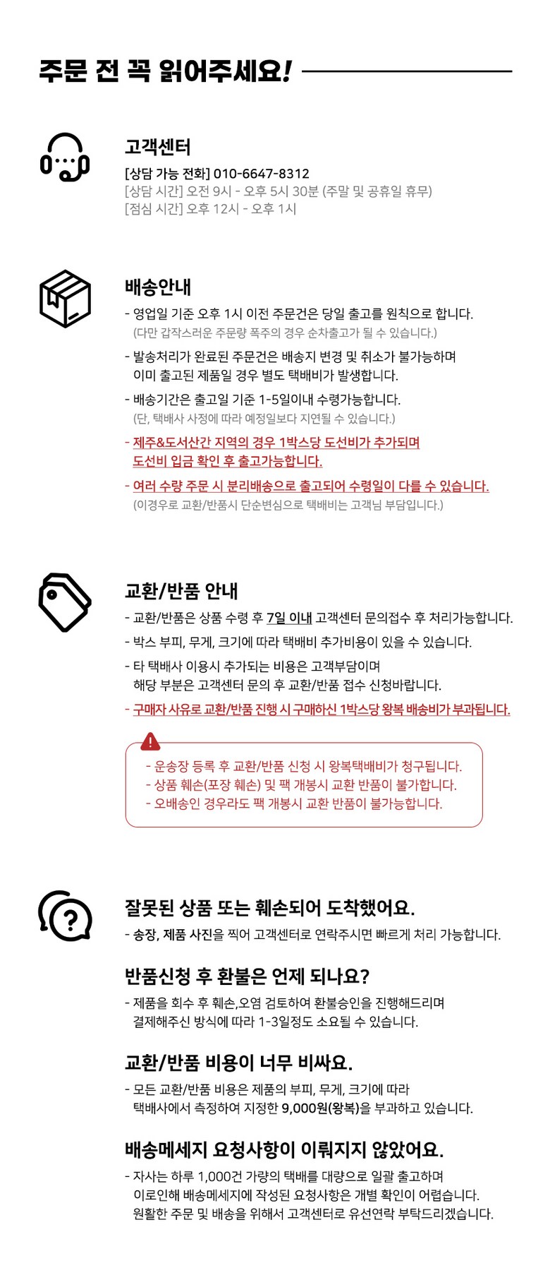 - ㆍ모니터 해상도의 차이로 인해 색상이나 이미지가 실제와 달라, 고객이 단순 변심으로 교환/반품을 무료로 요청하는 경우