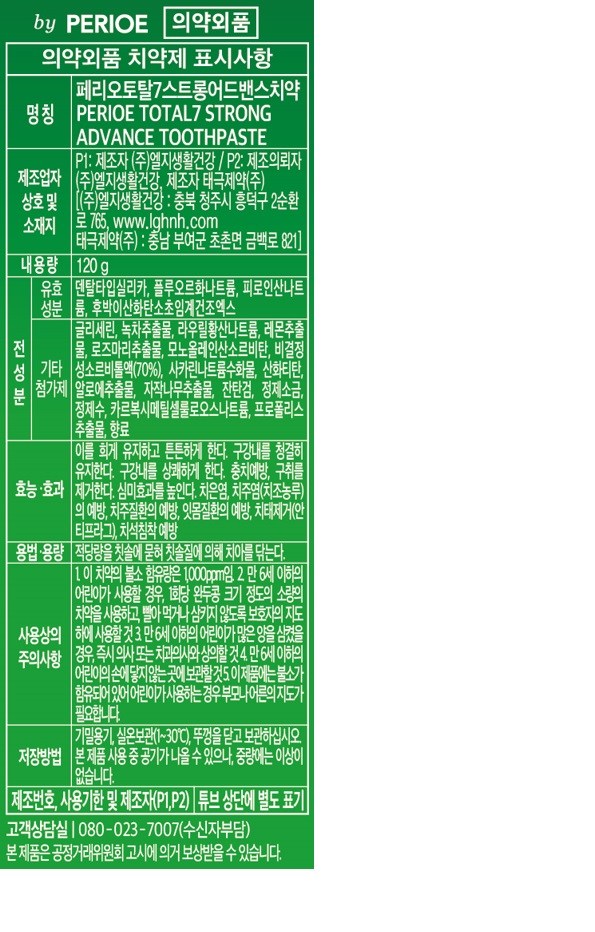| 품명 및 모델명 | 페리오토탈7스트롱어드밴스치약 | 인증/허가 사항 | 의약외품 |