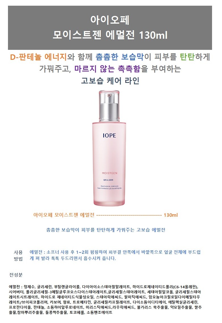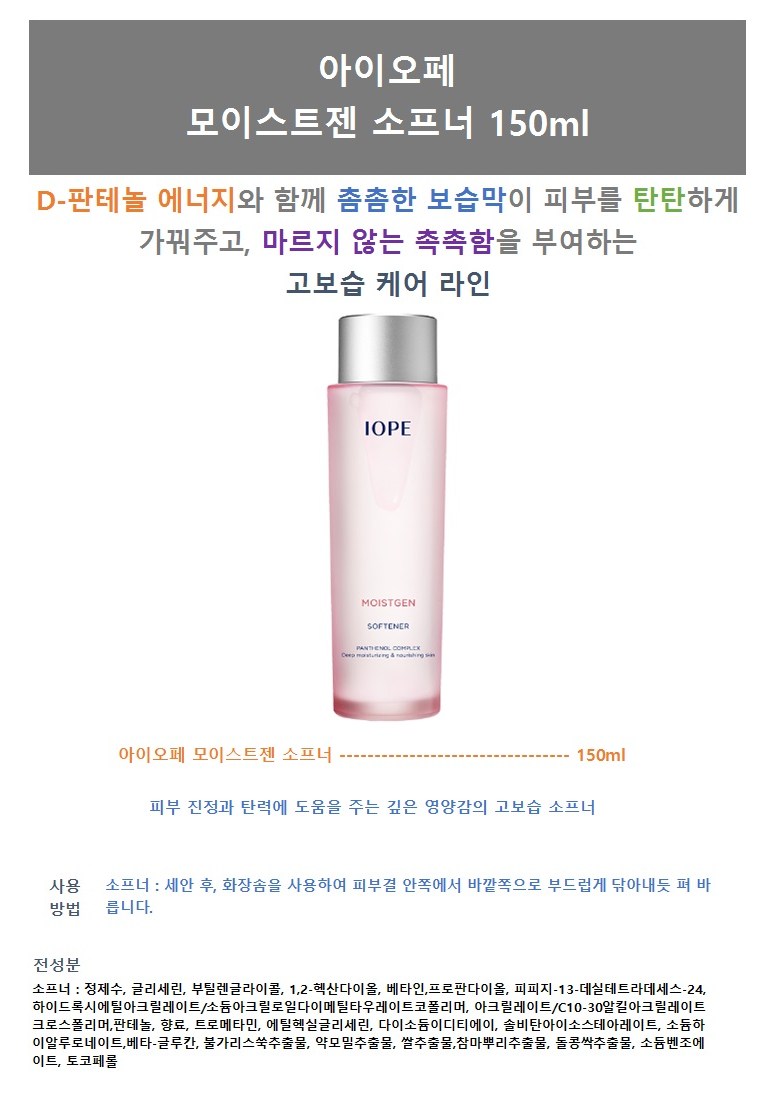 | 용량(중량) | 소프너 150ml + 에멀전 130ml + 크림 50ml | 제품 주요 사양 | 모든피부 |