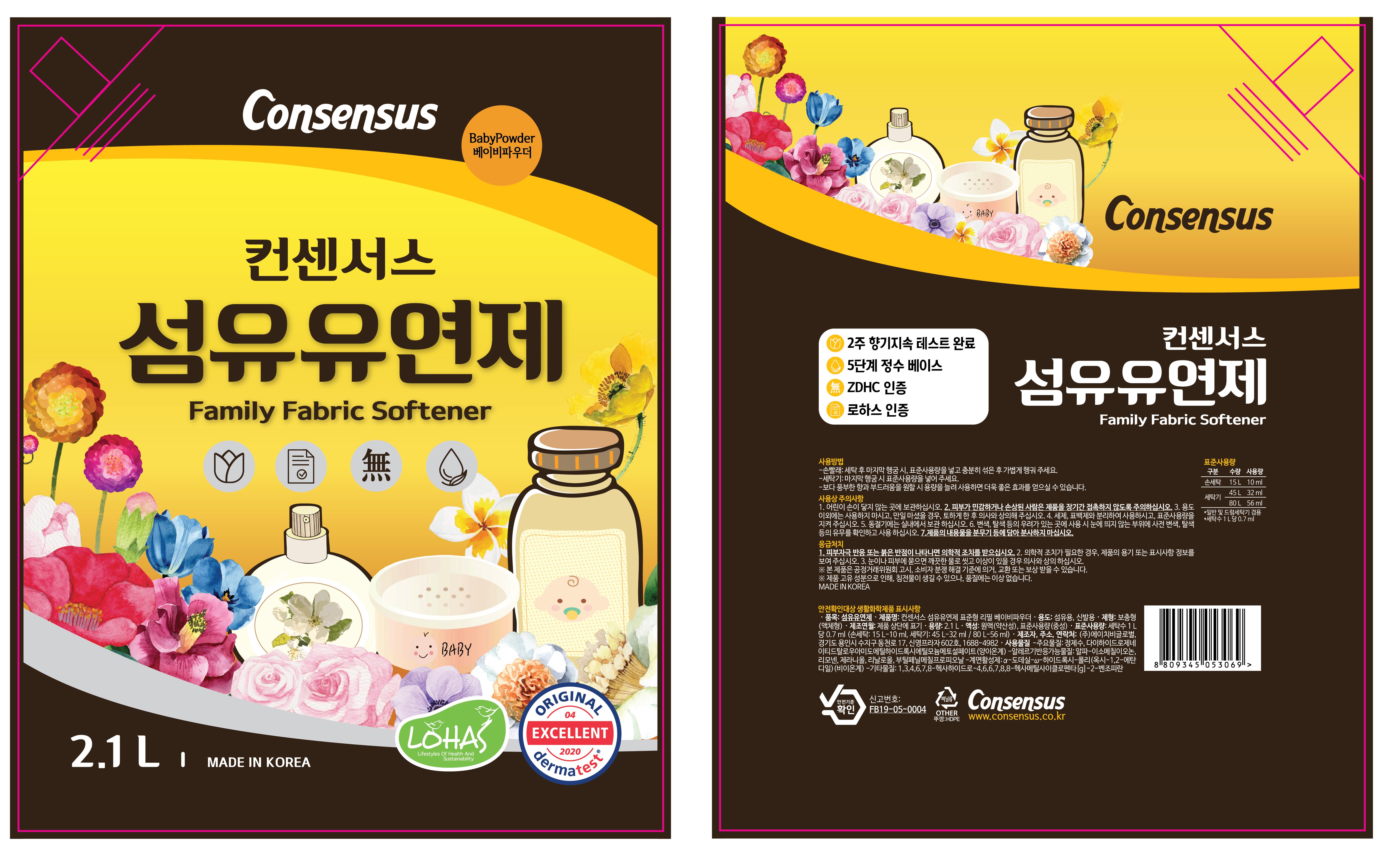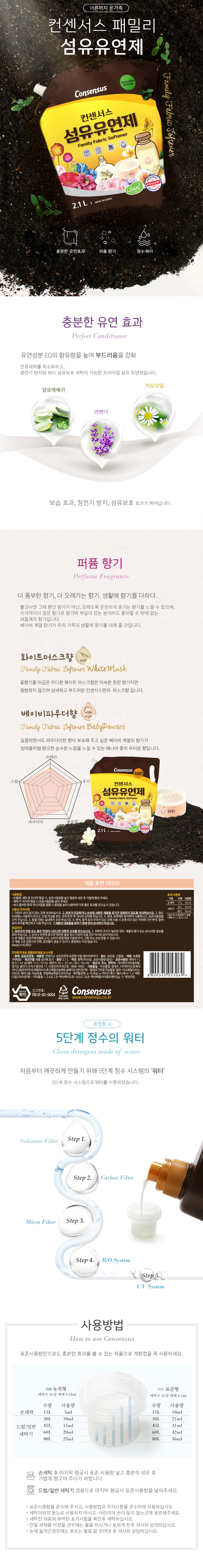 | 품목 및 제품명 | 섬유유연제 / 컨센서스 섬유유연제 표준형 리필 베이비파우더 | 용도(표백제의 경우 계열을 함께표시) 및 제형 | 섬유용, 신발용 / 보충형(액체형) |