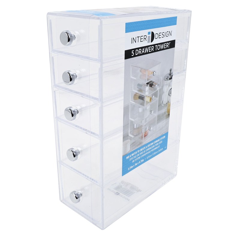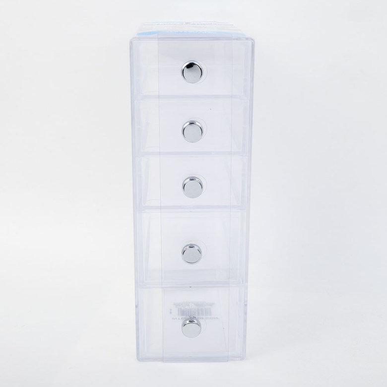 3개의 작은 서랍과 2개의 큰 사이즈 서랍으로 구성된 5칸의 서랍입니다. 화장품이나 사무용품, 보석, 악세서리 등을 담아 보관하기 좋습니다. 투명한 플라스틱 재질로 내용물을 쉽게 파악할 수 있습니다.