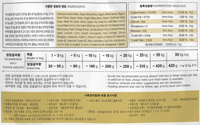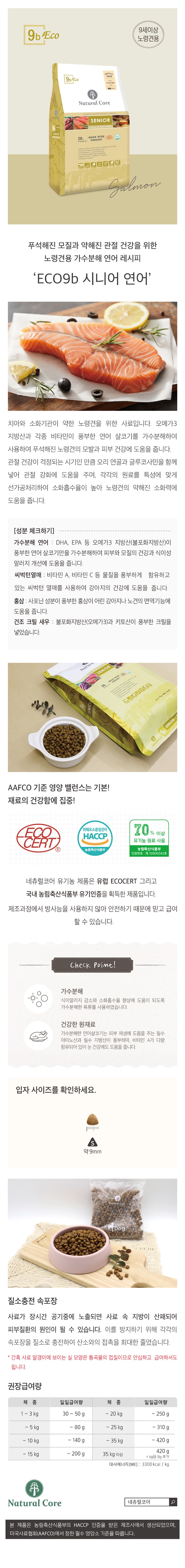 | 품명 및 모델명 | 네츄럴코어 에코9b 시니어 살몬 | 인증/허가 사항 | 사료관리법에 따른 성분등록번호 : 컨텐츠 참조 |