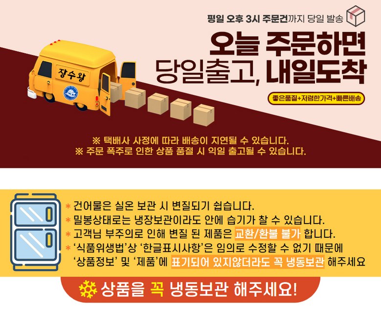 | 배송방법 | 신선/냉장/냉동 | 배송비 | 무료배송 · 도서산간 추가 배송비 - 제주 지역: 3,000원 - 도서산간 지역: 5,000원 |